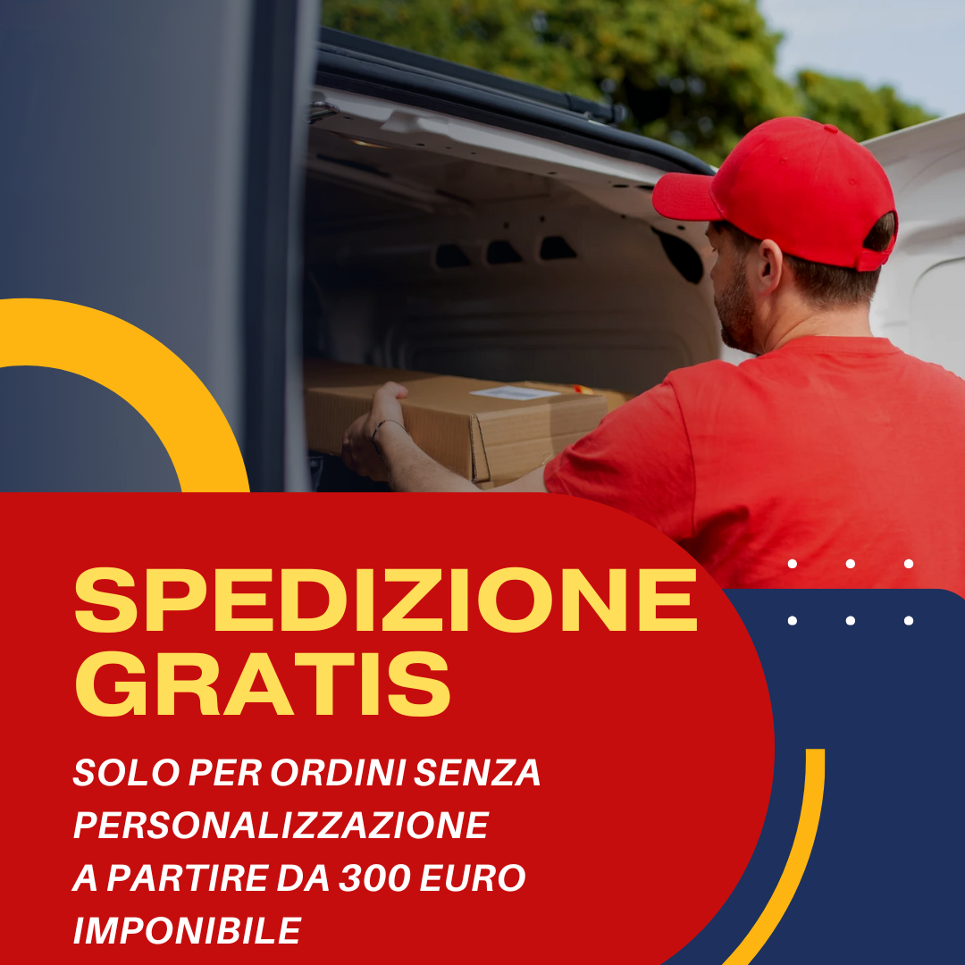 - Spedizione gratuita per ordini superiori a 300 euro di imponibile solo per ordini senza personalizzazione.