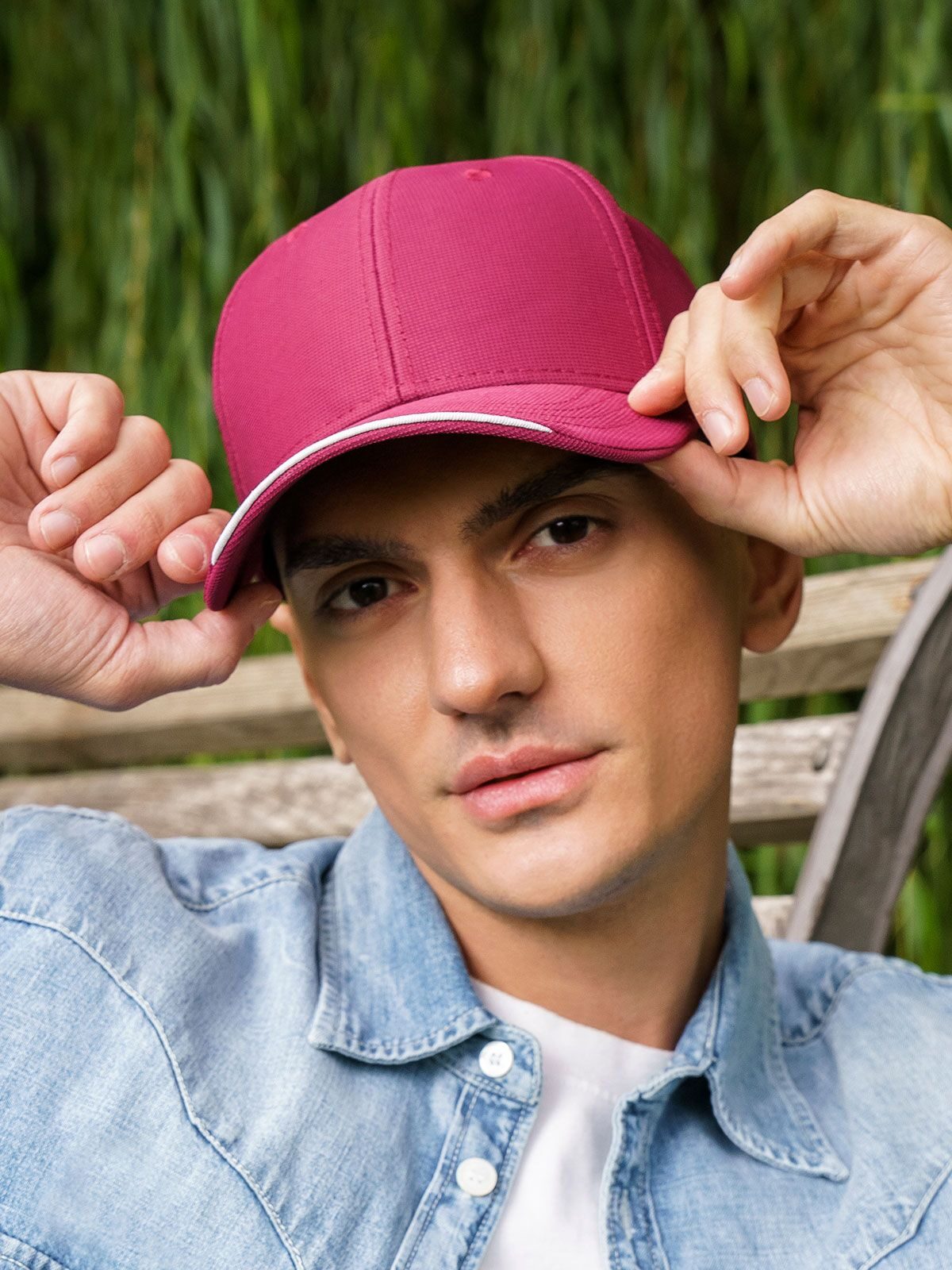 Classico berretto automobilistico rivisitato in jacquard di poliestere riciclato, 6 pannelli, bordino sulla visiera curva, forma strutturata con chiusura a strappo con foro in plastica, etichetta removibile.