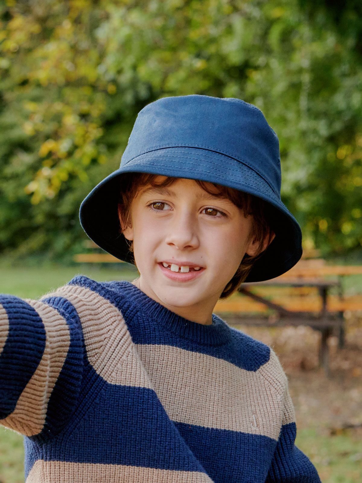 Cappello da bambino modello pescatore, in cotone biologico e trattamento UPF 50+. Etichetta removibile.