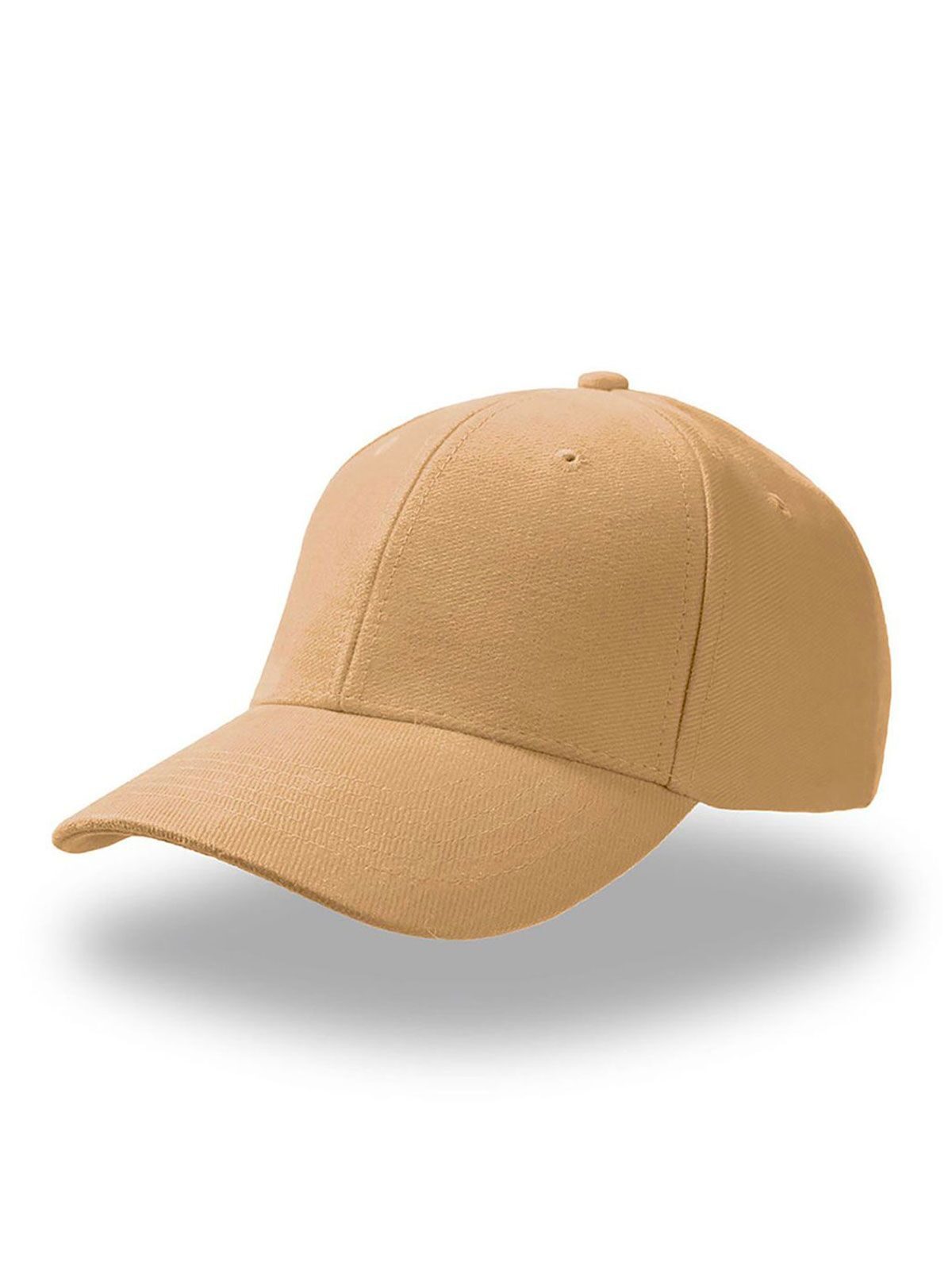 Cappellino a 6 pannelli, occhielli ricamati, pannello frontale rinforzato, visiera pre-curvata, chiusura con fibbia e foro cucito, 6 cuciture su visiera, parasudore in cotone, etichetta removibile, taglia unica.
