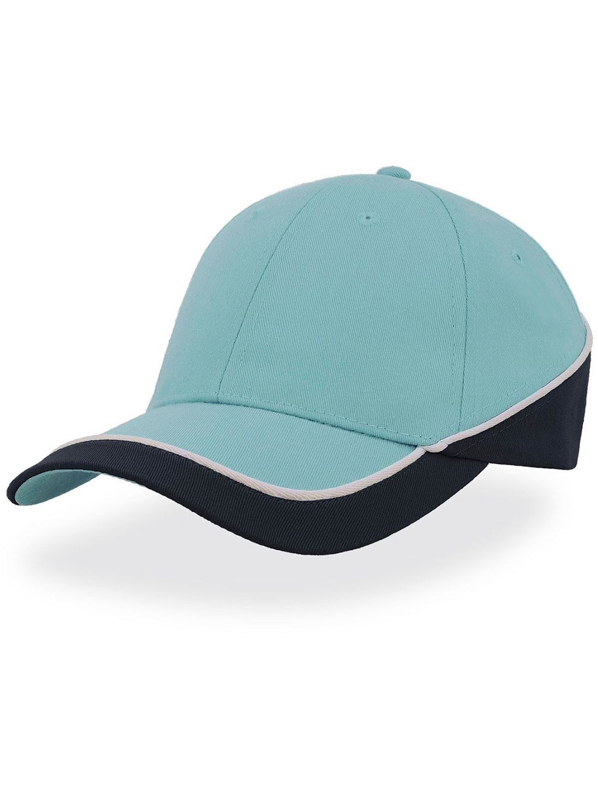 Cappellino baseball 6 pannelli, linea aerodinamica, due colori abbinati con profilo a contrasto, chiusura con cinturino in tessuto e velcro, etichetta removibile, taglia unica.