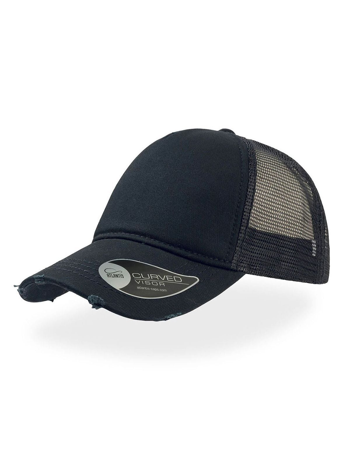 Trucker cap a 5 pannelli, mesh posteriore e laterale, visiera destroyed pre-curvata, pannello frontale non strutturato, ideale per la stampa, 4 cuciture su visiera, parasudore in cotone, etichetta removibile.