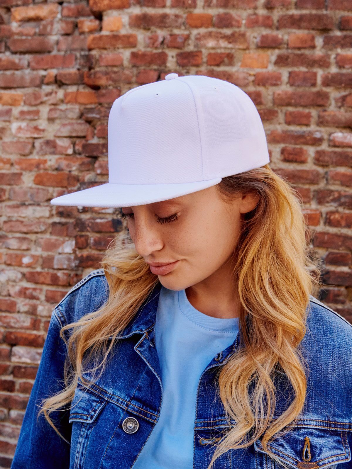 Cappello 5 pannelli in poliestere riciclato, con visiera piatta e chiusura snapback in in PVC riciclato, etichetta removibile.