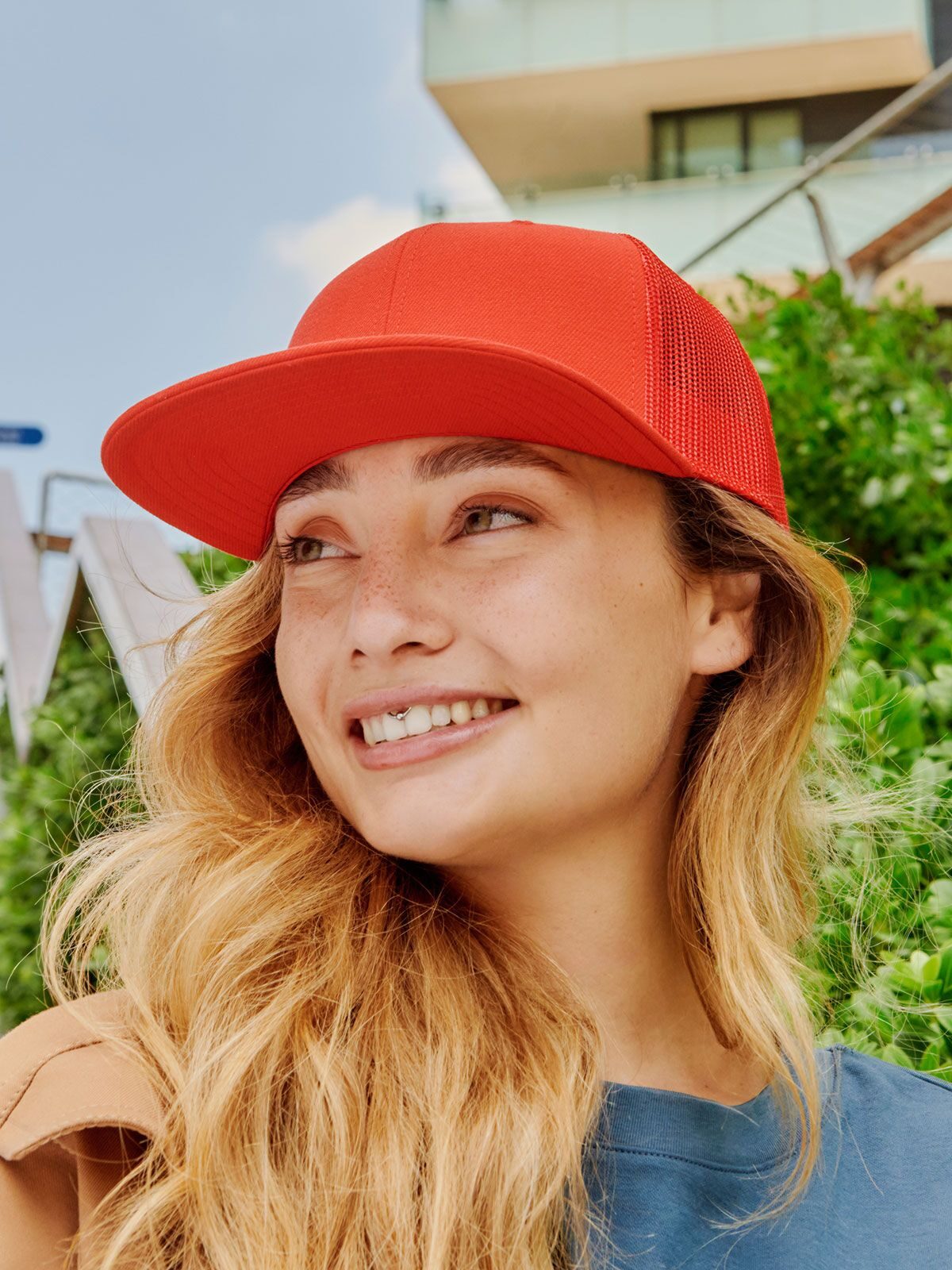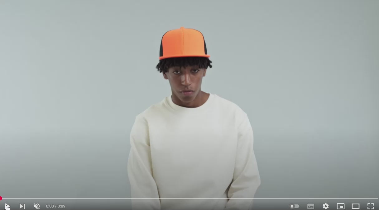 Cappello 6 pannelli in poliestere riciclato, visiera piatta, rete laterale e posteriore in poliestere riciclato, chiusura snapback in pvc, etichetta removibile.