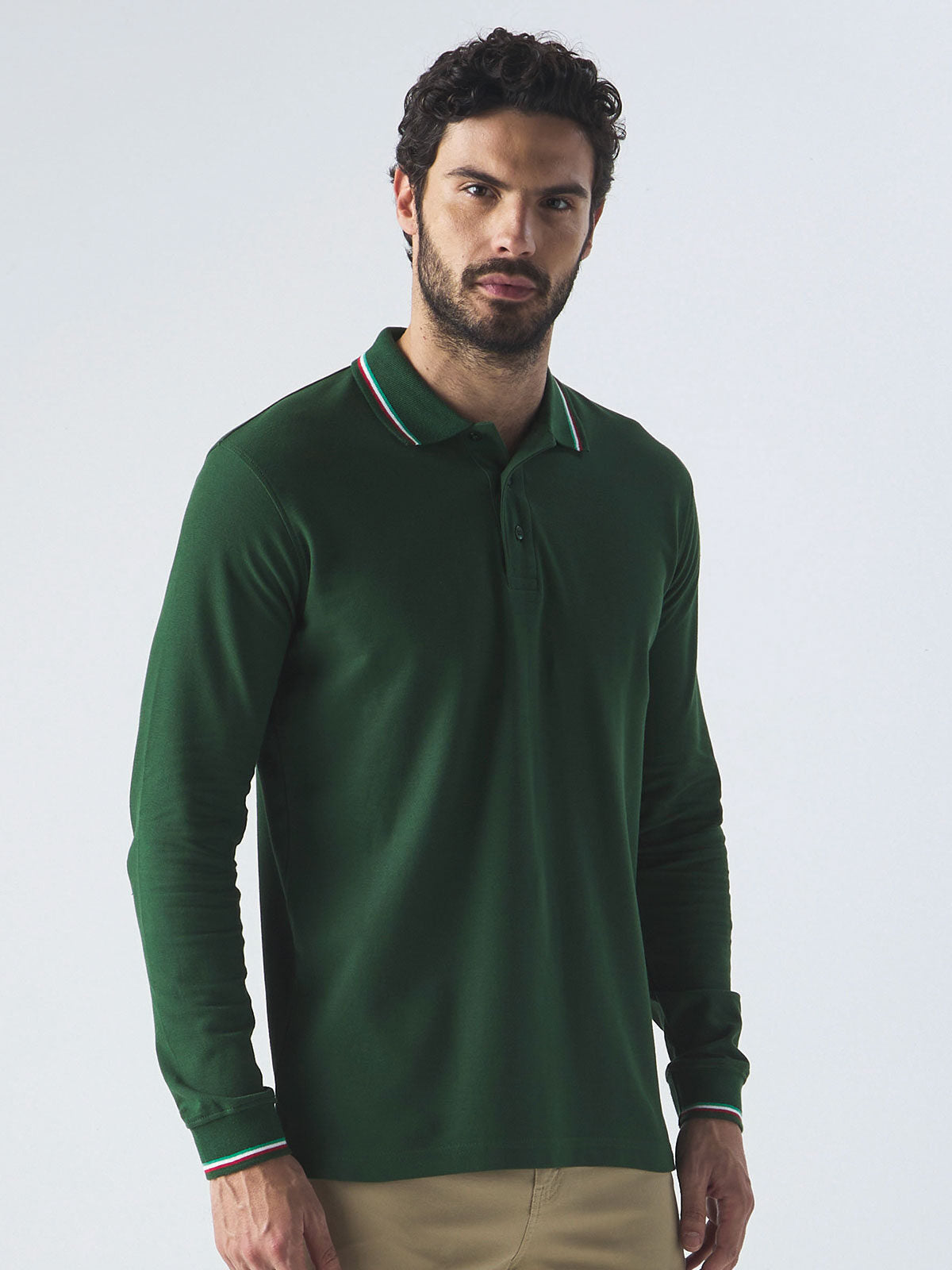 Polo a maniche lunghe set-in, 3 bottoni tono su tono, nastro di rinforzo e bordature tricolore sul collo, costina sulle maniche, struttura con spacchetti e cuciture laterali. Composizione: Grey Heather: 85% cot. 15% visc.