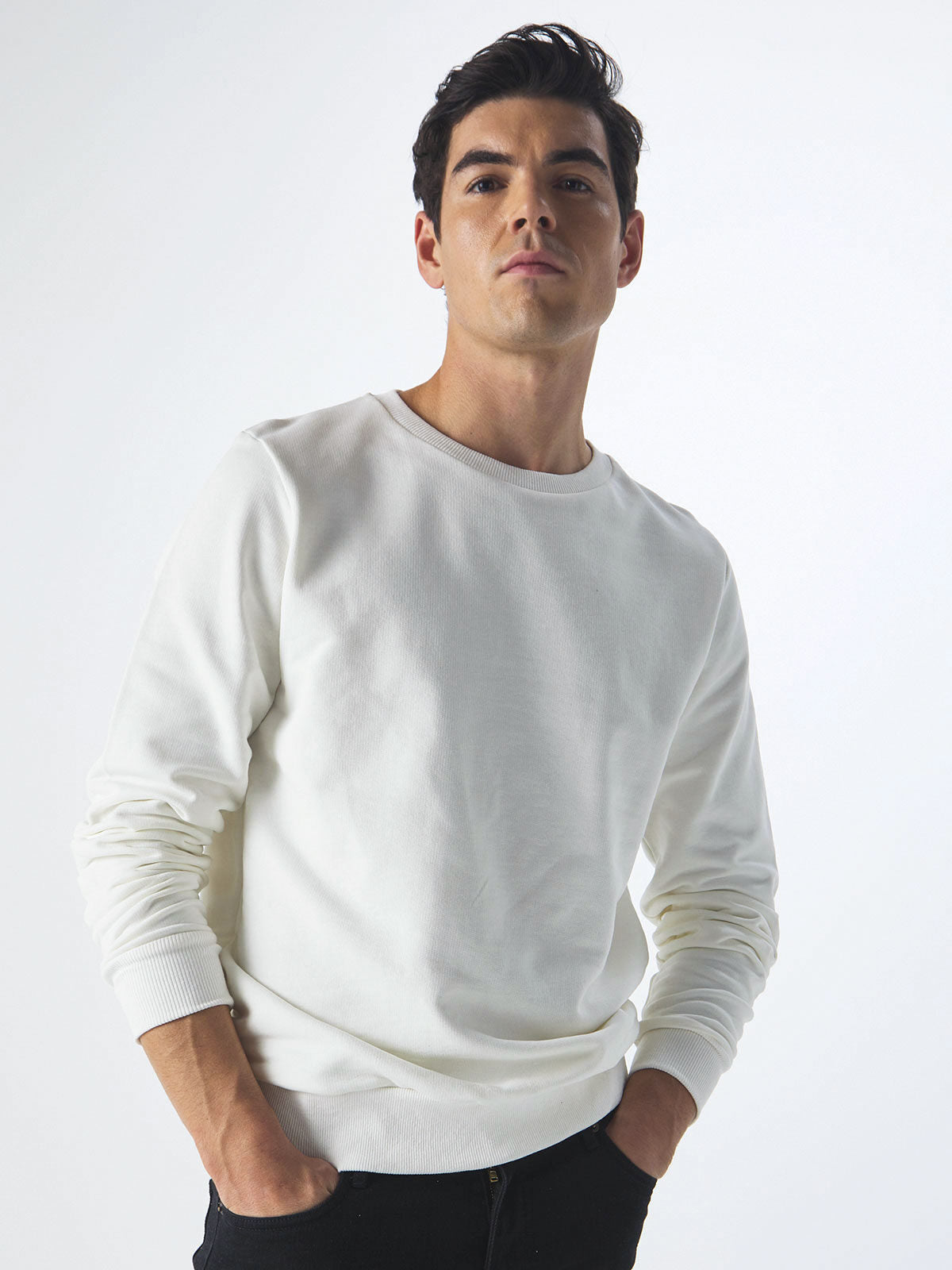 Felpa girocollo in french terry, manica dritta, fit moderno, struttura con cuciture laterali, collo senza etichetta, ma con un piccolo adesivo taglia, etichetta composizione, taglia e made in Italy sul fianco. Non felpata internamente. Colore NTR adatto per tinto in capo con cuciture 100% cotone. Prodotta in Italia.
