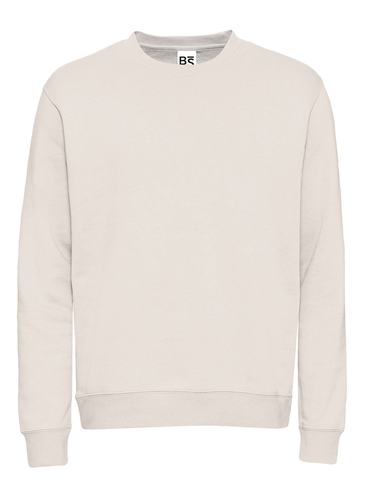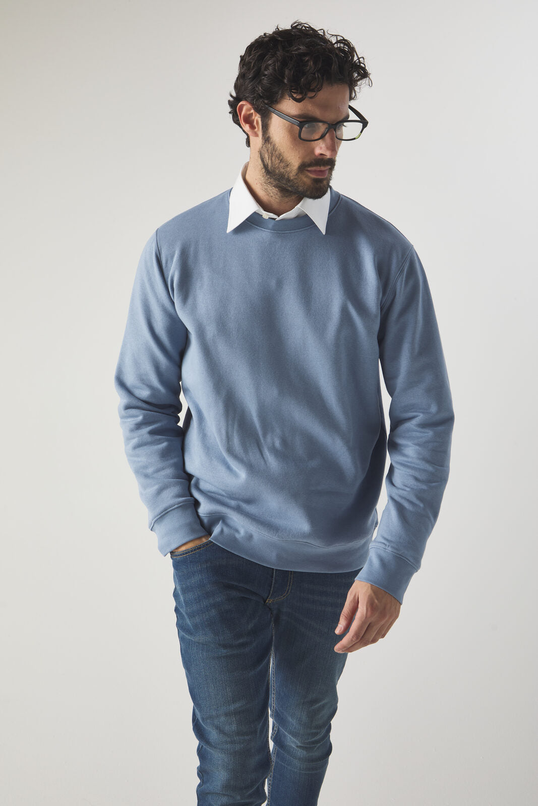 Felpa girocollo, felpata internamente, maniche set-in. Collo, polsini e orlo inferiore in costina, rinforzo sul colletto, struttura con cuciture laterali. Etichetta strappabile. Tessuto PST: interno in poliestere ed esterno 100% cotone.