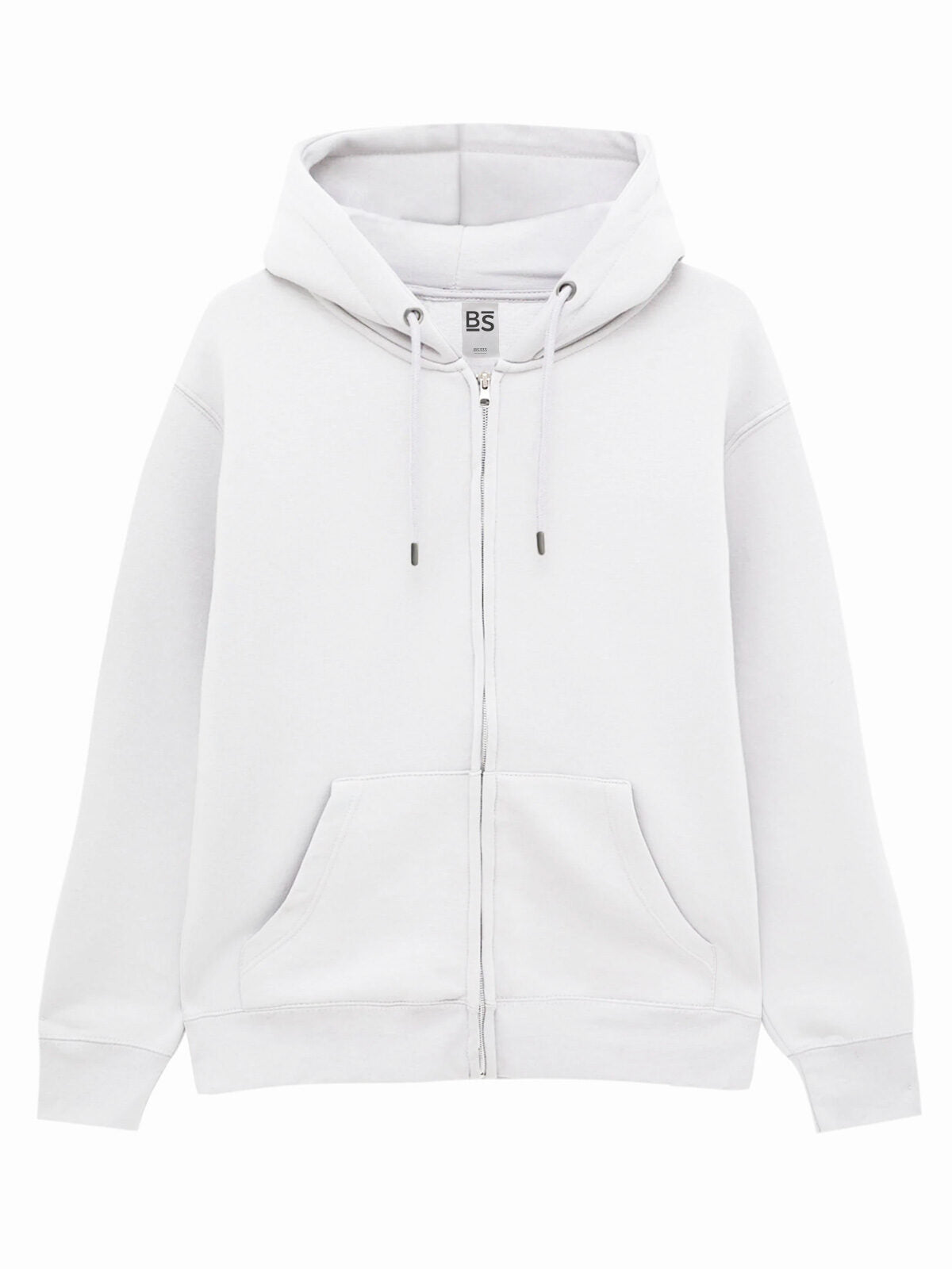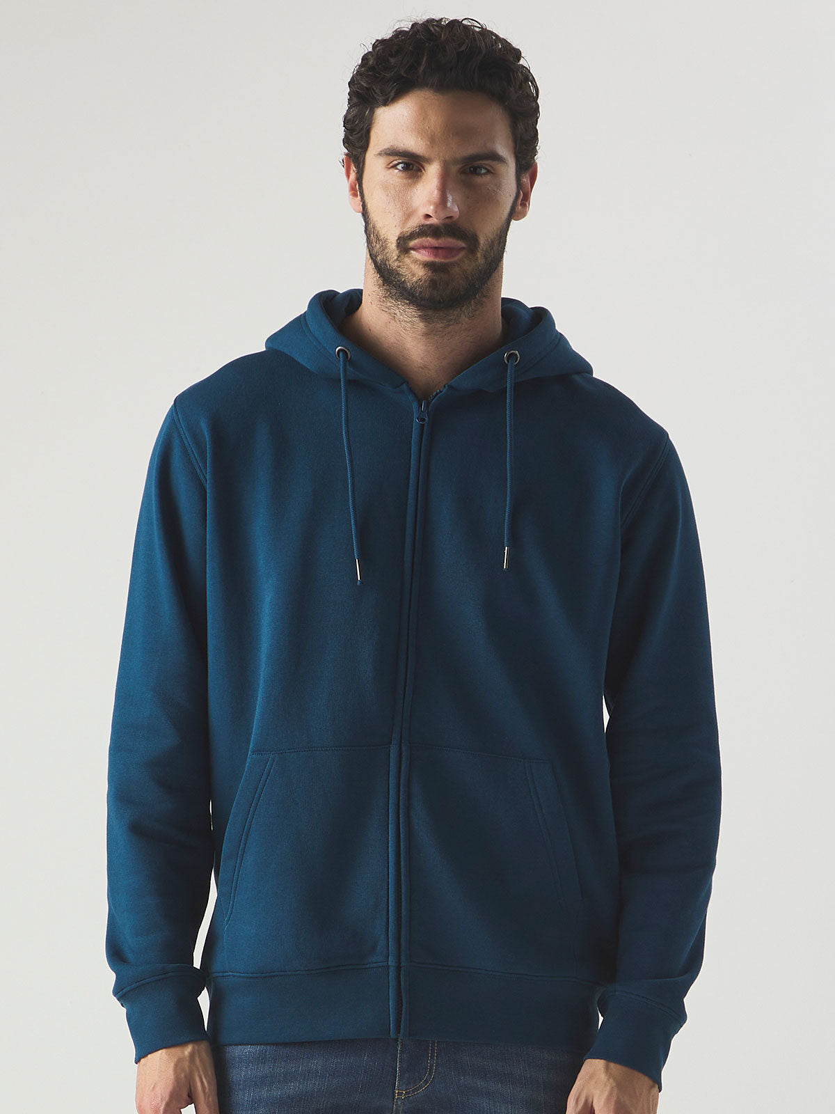 Felpa con cappuccio a doppio strato, felpata internamente, maniche set-in, cerniera tono su tono coperta, occhielli in metallo, cordini con punta in metallo, tasca a marsupio, orlo inferiore e polsini in costina, struttura con cuciture laterali. Tessuto PST: interno in poliestere ed esterno 100% cotone. Etichetta strappabile.
