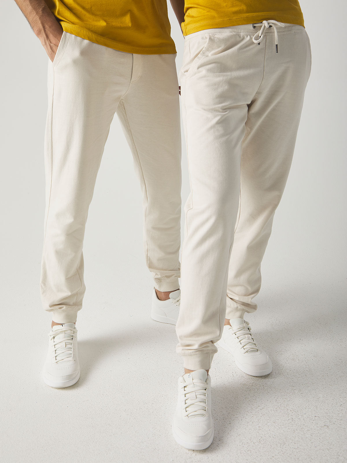 Pantaloni in felpa french terry, interno girovita e tasche in jersey, tasca a filetto sul retro, fondo gamba a costine 1x1, cordini tondi tono su tono con punta in metallo, occhielli in metallo, impuntura flatlock su tutte le cuciture. Etichetta strappabile. Parte esterna: 100% cotone, parte interna: 50% cotone, 50% poliestere.