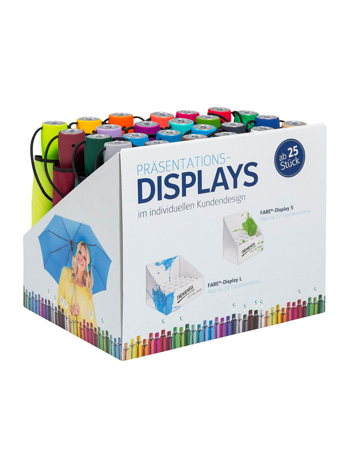 Espositore con 24 mini ombrelli FARE® AOC (art. 5460 in vari colori), cartone plastificato con design Perfect match , divisione 6x4, adatto per ombrelli con diametro chiuso fino a ca. 5,5 cm. Larghezza: 28 cm, altezza: 34 cm, profondità : 26 cm.