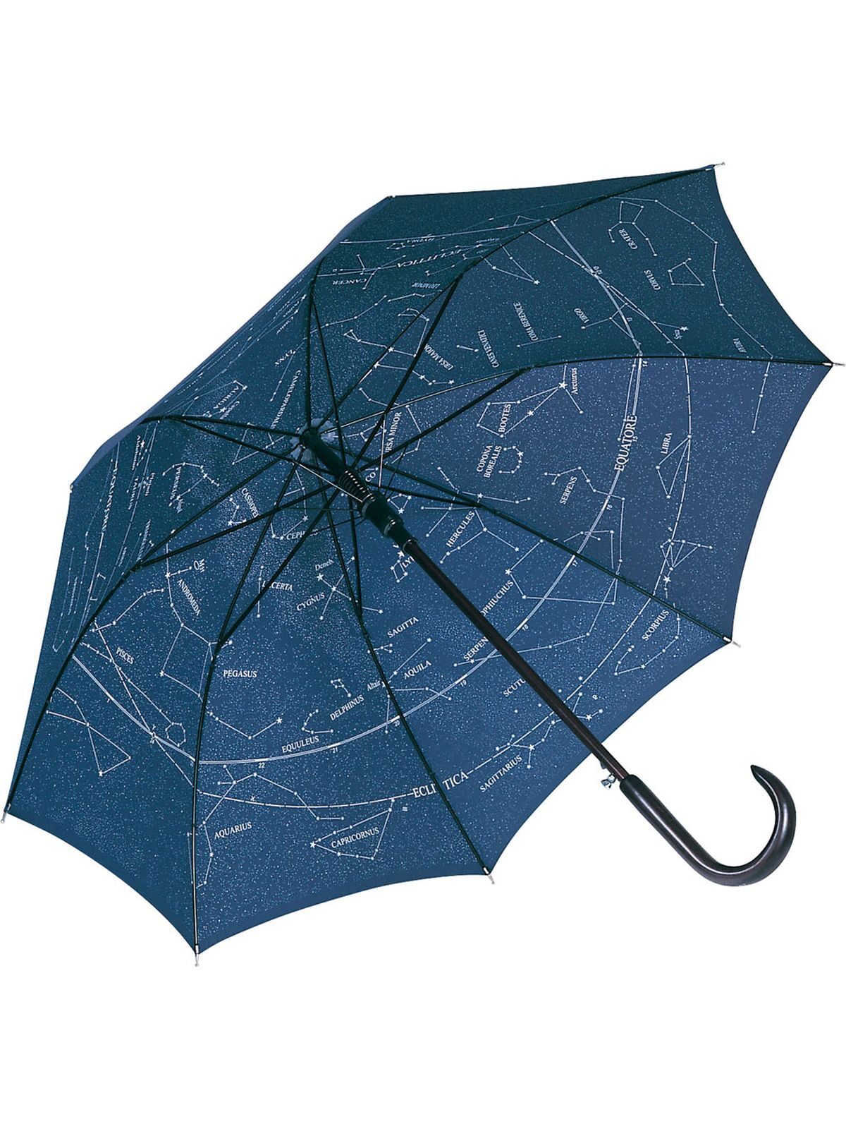 Fodera interna con stelle rappresentate su tutta la superficie, confortevole funzione automatica per un'apertura rapida, stecche in fibra di vetro stabile, proprietà Windproof per un'elevata stabilità del telaio e migliore resistenza al vento, bastone e manico a uncino tondeggiante in vero legno, dal bellissimo aspetto. Diametro: 105 cm, lunghezza da chiuso: 89 cm.