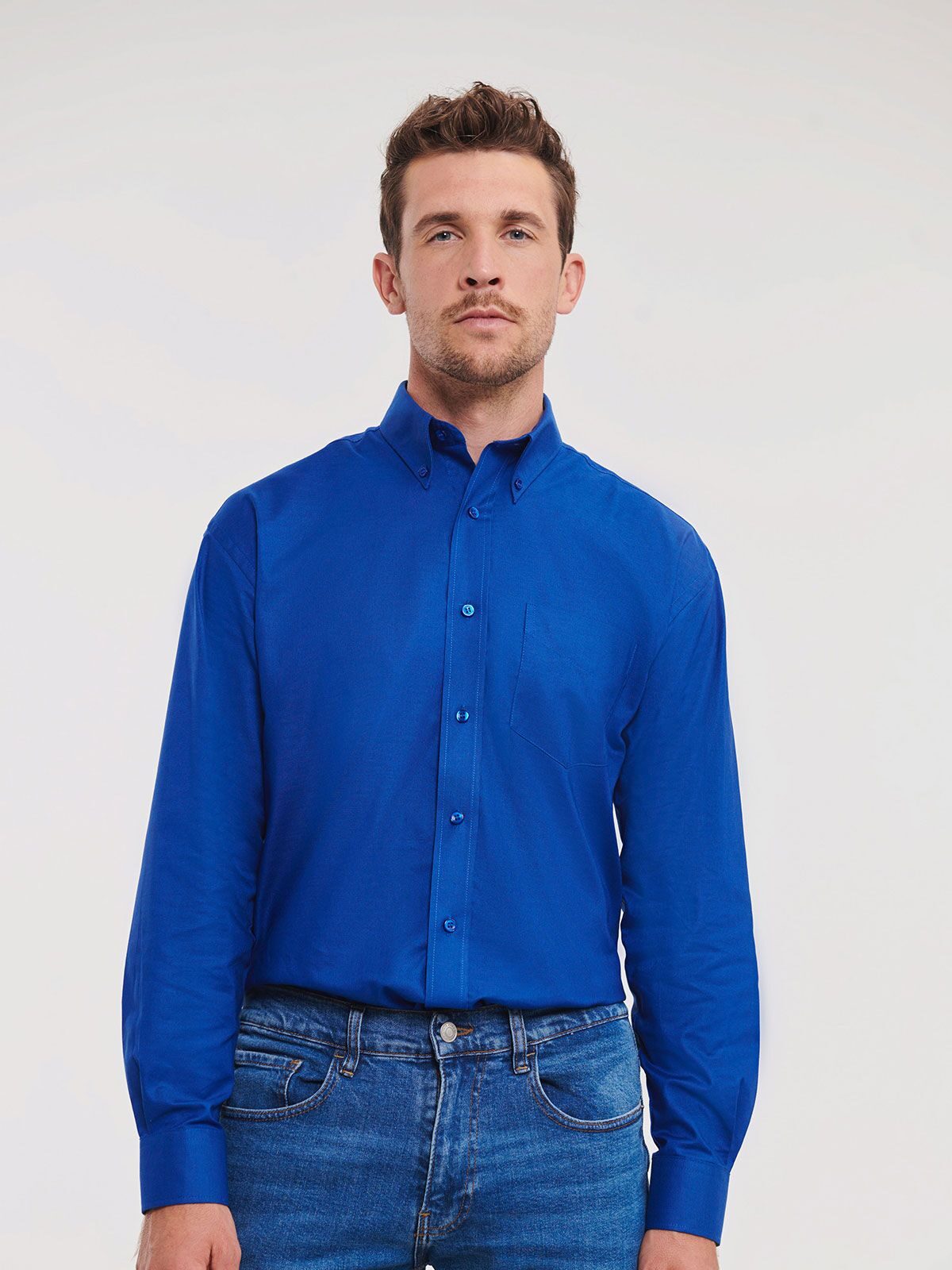 Camicia con collo button down, tasca lato cuore. Orlo stondato, bottone di ricambio, polsino stondato con due bottoni in tinta. (Col. 30: 130g/m²).