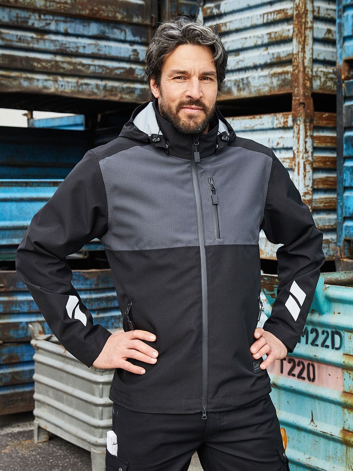 Rivestimento: 100% pol. ric. Giacca da lavoro antivento, idrorepellente e traspirante, per condizioni climatiche estreme (10.000mm colonne), permeabile al vapore (5,000 g/m2/24h), colletto alto, cappuccio removibile, dettagli riflettenti (no DPI), zip YKK.