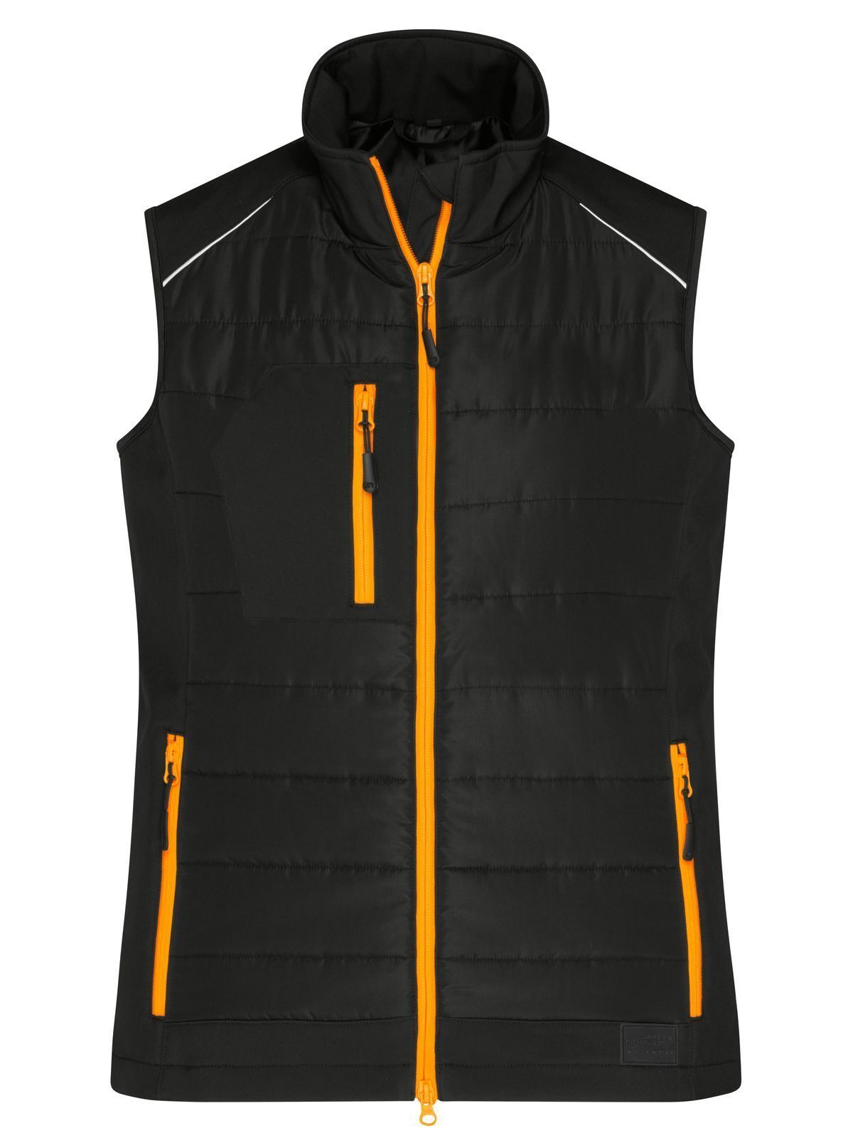 Rivestimento: 100% pol. ric. Imbottitura: 100% pol. Gilet softshell a due strati, idrorepellente e antimacchia grazie al BIONIC FINISH ECO, imbottitura Warming DuPont Sorona, colletto alto, tasche laterali e tasca sul petto con zip, tasca interna, dettagli riflettenti. Zip YKK, leggermente sciancrata.