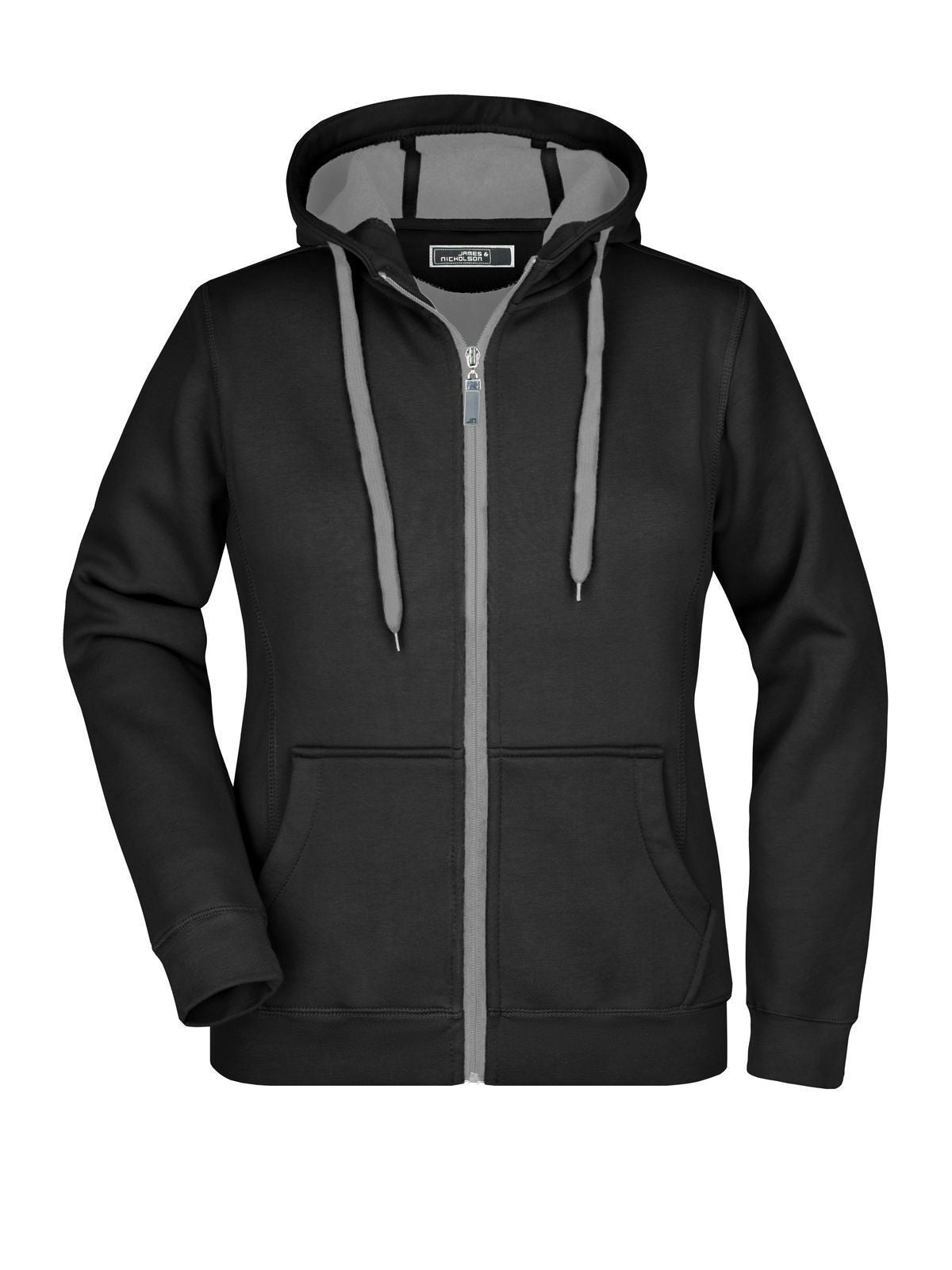 Felpa sportiva con maniche set-in. Zip intera, parte interna del cappuccio, parte interna della felpa e cordoncini di colore contrastante, polsini e orlo inferiore con elastane, tasca a marsupio, leggermente sfiancata, struttura con cuciture laterali, felpata internamente.