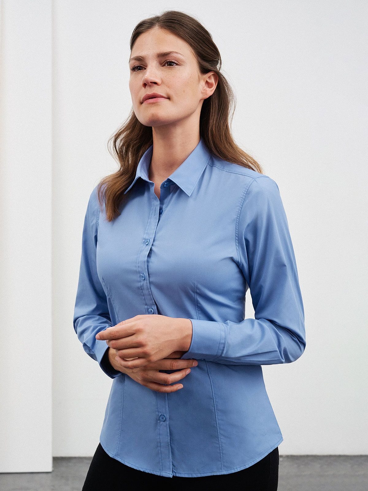 Camicia poplin easy care, con orlo arrotondato, taglio femminile leggermente sfiancato ai lati.