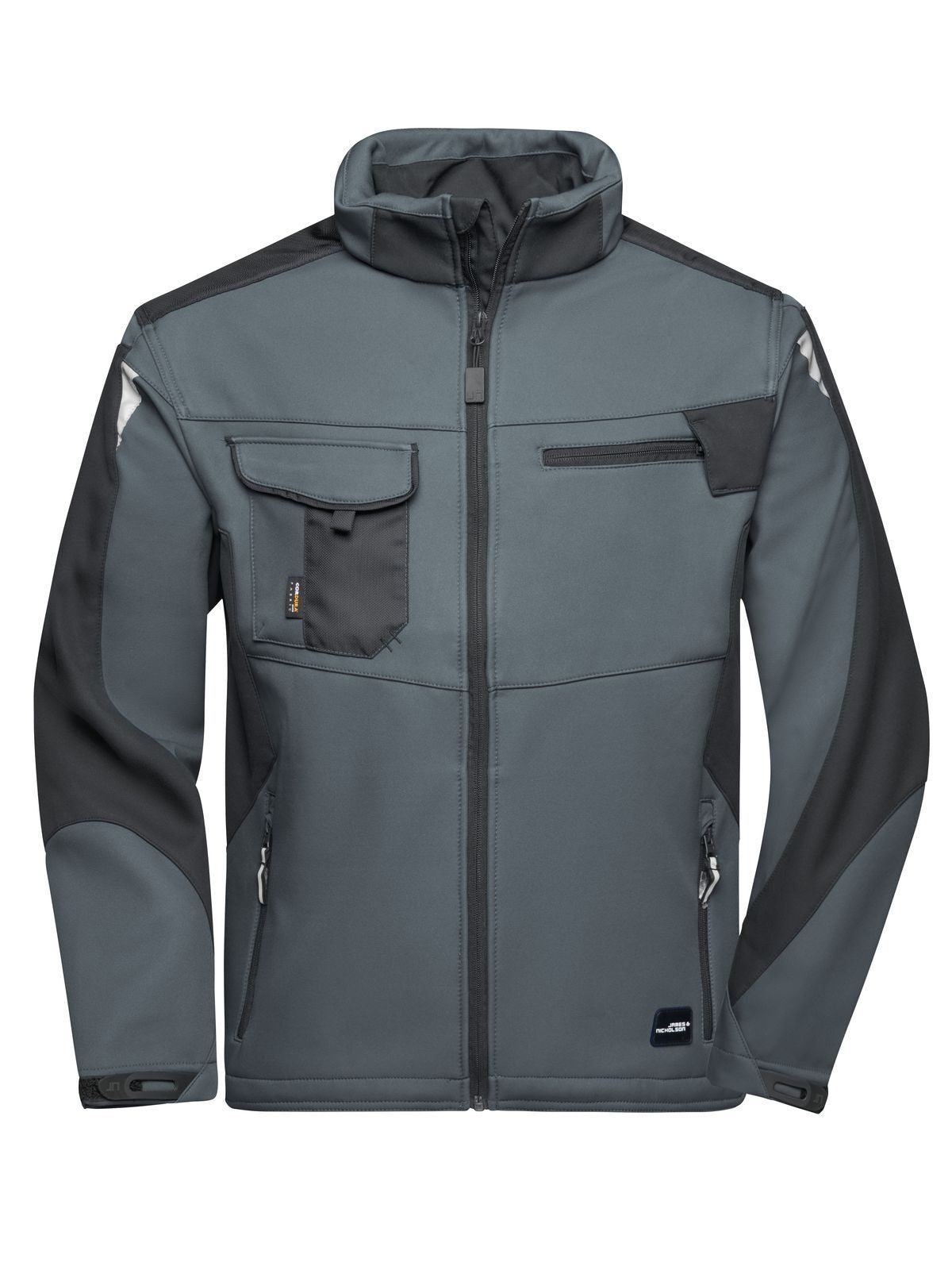 Giacca in softshell resistente al vento e all'acqua fino a 2000 mm, traspirante, colletto rigido, nastro di rinforzo alle spalle con cordura, cerniera intera foderata con guarnizione antivento. 2 tasche laterali con zip, 2 tasche pettorali di cui una con cerniera, tasche interne. dettagli catarifrangenti sulle maniche e sul dorso.