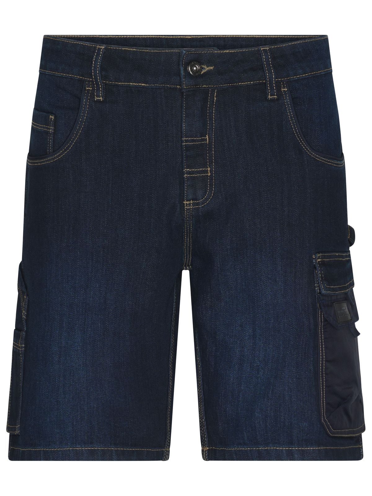Jeans corti con passanti per cintura, triple cuciture, tasche con porta-monete, 2 tasche posteriori, diverse tasche porta attrezzi.