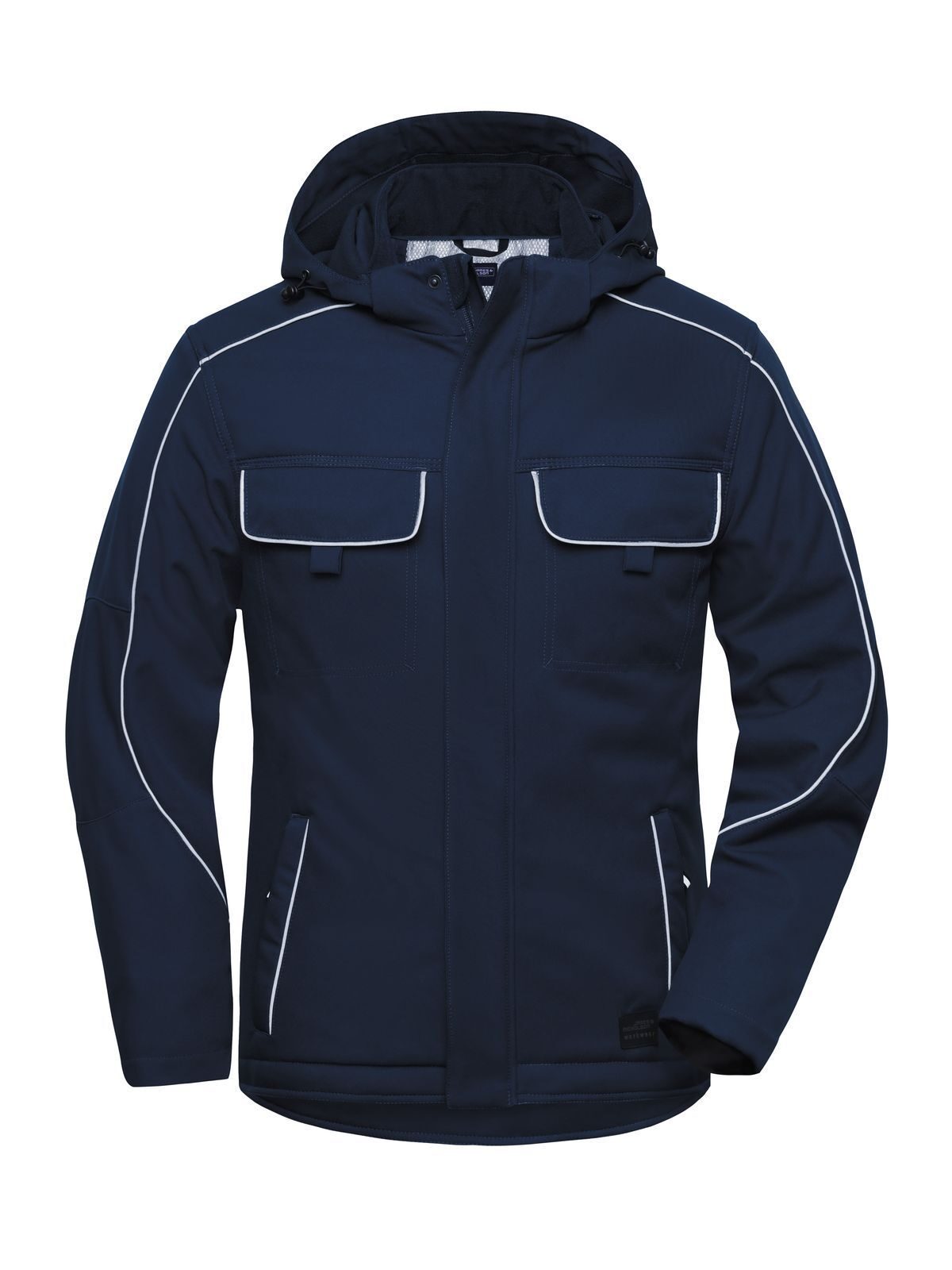 Giacca in softshell robusta e resistente, antivento e idrorepellente (colonna d'acqua 2,000 mm), traspirante e permeabile al vapore (2,000g/m²/24h), collo alto con morbido pile interno, cappuccio removibile e regolabile, maniche ergonomiche, polsini interno manica, retro esteso, zip interna nascosta con protezione per il mento, tasche laterali con zip e tasche interne, tasche sul petto con cucitura su un solo lato per facilitare la decorazione, dettagli riflettenti (senza funzione protettiva, senza DPI) su tasche, maniche, spalle e sul retro, zip YKK. Per evitare che il prodotto si rovini, bottoni e zip sono nascosti.