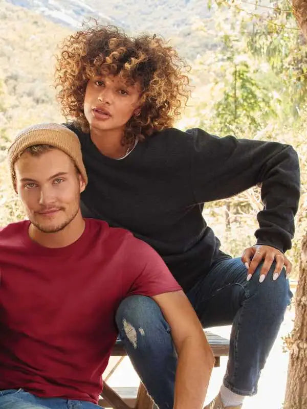 Felpa girocollo con maniche set-in caratterizzata da una morbidezza superiore, realizzata con poliestere riciclato al 100% e cotone coltivato in USA da fonti sostenibili. Molto traspirante per un comfort che dura tutto il giorno. Alta densità di punti per una tela di stampa liscia, colletto, polsini e cintura a costine, cuciture a due aghi su collo, giromanica e cintura, nastratura da spalla a spalla. Etichetta removibile.