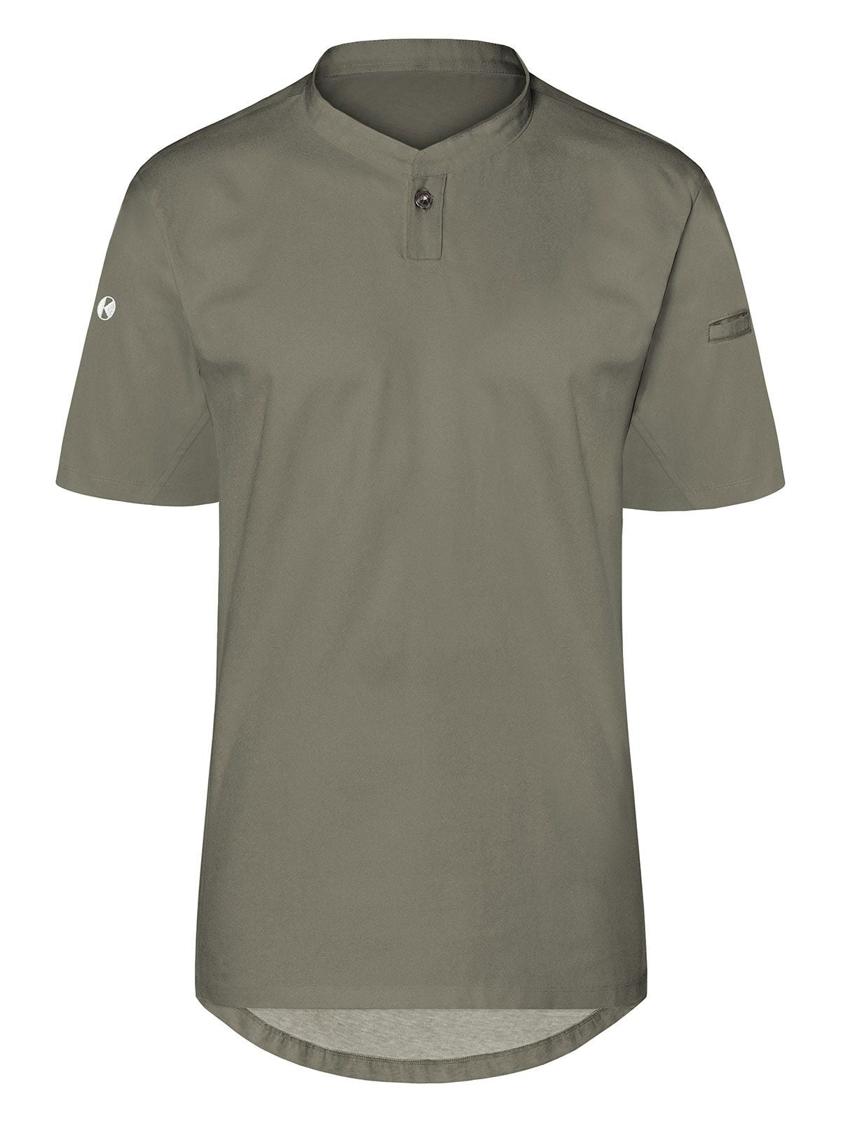 Moderna t-shirt da lavoro a maniche corte, traspirante e con regolazione dell'umidità , slim-fit, sciancrata in vita, colletto alto e abbottonatura corta, taschini con bottone, a filetto sul petto e sulla manica.