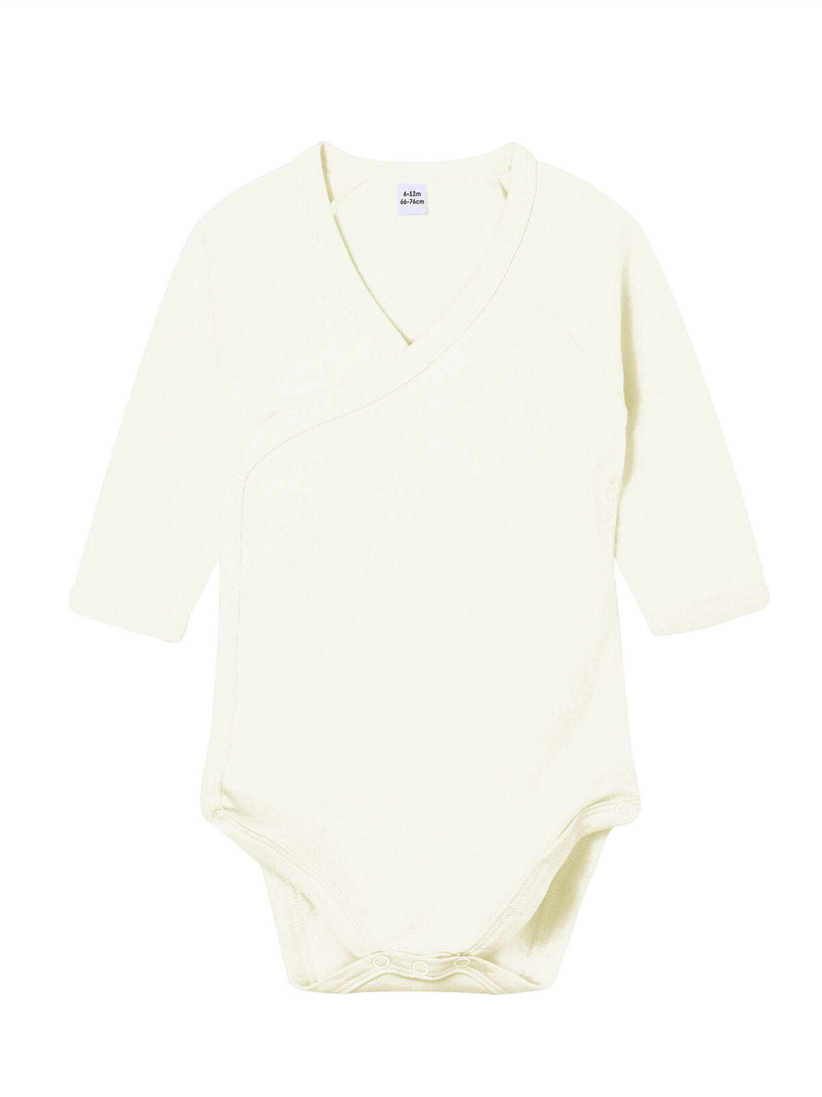 Body da neonato incrociato stile kimono, con bottoni automatici nickel-free al collo e al cavallo. Bordino intorno a collo, alle estremità delle maniche e al cavallo per mantenere la forma dell'indumento. Maniche lunghe raglan. Etichetta taglia removibile al collo. Etichetta con istruzioni di lavaggio in cotone organico.