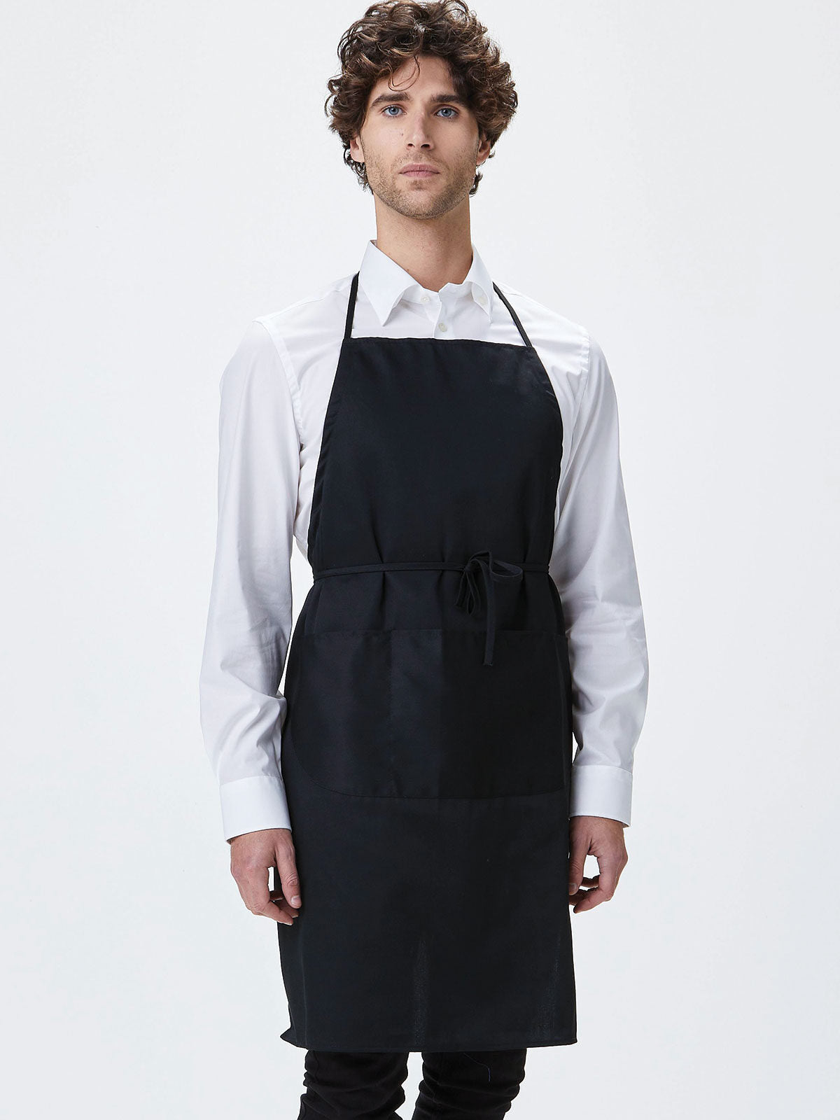 Grembiule con pettorina con laccio scorrevole, ampia tasca centrale con tre compartimenti separati. Lavabile a 40°C.