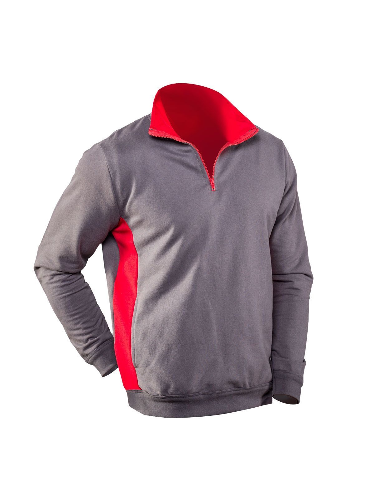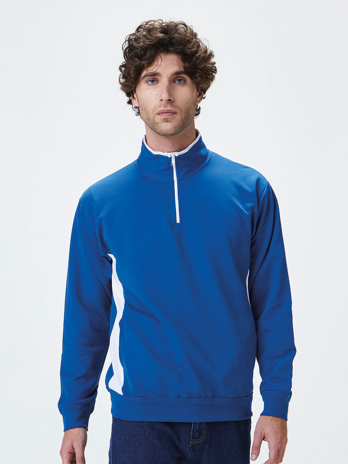 French terry. Felpa mezza zip bicolore parte interna del collo, fianchi, interno tasca e cerniera di colore contrastante. Struttura con cuciture laterali, maniche set-in.