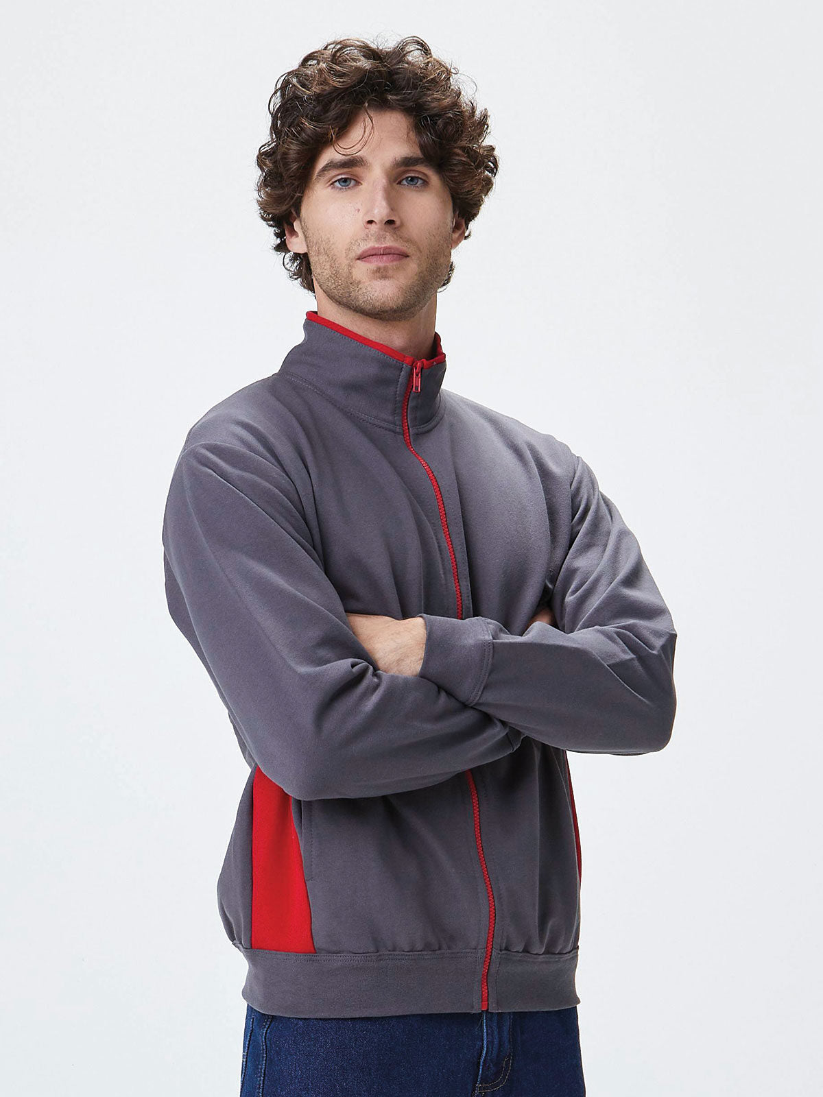 French terry. Felpa con zip intera bicolore, parte interna del collo, fianchi, interno tasca e cerniera di colore contrastante. Struttura con cuciture laterali, maniche set-in.