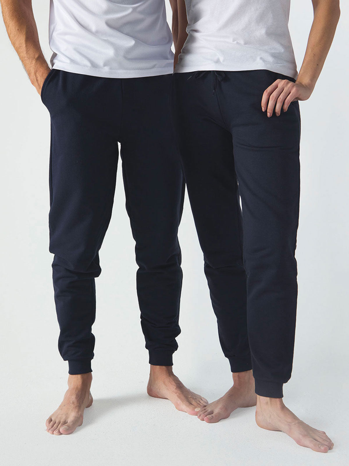 Pantaloni in felpa con polsini alle caviglie, non felpati, due tasche laterali, elastico in vita con cordoncino tono su tono.