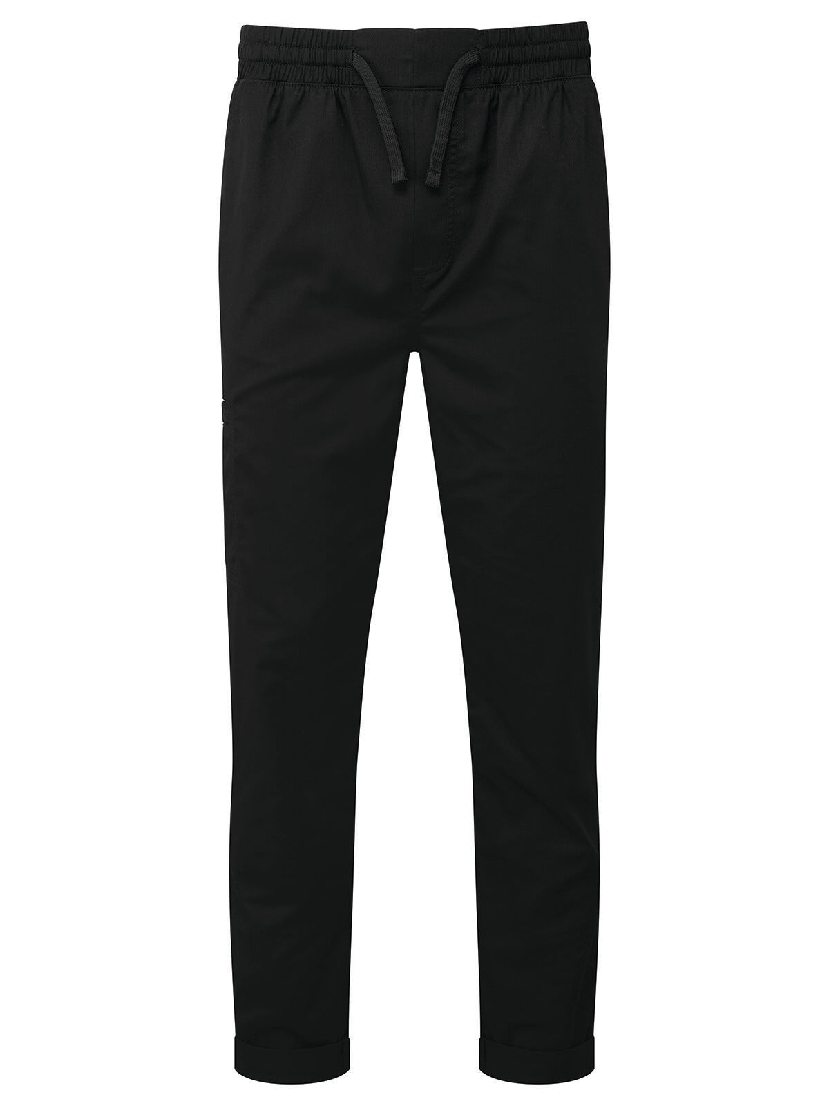 Pantaloni cargo da chef in tessuto policotone riciclato, con vita elasticizzata e coulisse, finta patta con cucitura, molteplici tasche, taglio affusolato nella parte inferiore della gamba con orlo risvoltabile.