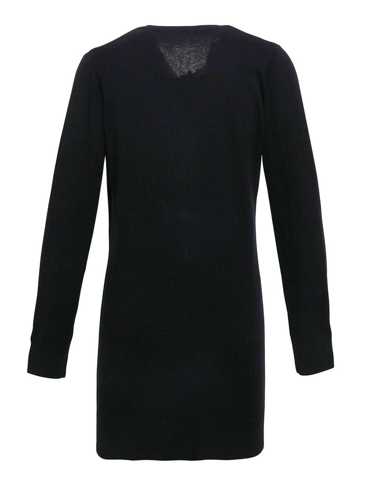 Cardigan da donna lungo, tessuto morbido, chiusura con cinque bottoni, due comode tasche, collo polsini e orlo in maglina. Cuciture laterali.