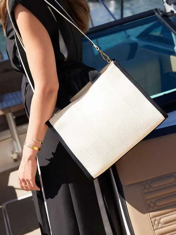 66% poliestere, 23% cotone, 11% altre fibre. Borsa tote in tessuto twill, con manico, scomparto principale e tasca interna con cerniera, zip interna nascosta per favorire la decorazione, imbottitura in schiuma, fodera morbida al tatto in poliestere riciclato, bordi in tessuto, finiture in metallo dorato, tracolla regolabile a contrasto. Etichetta removibile. Lunghezza manici: 32cm. Lunghezza tracolla: 172cm. Dimensioni: 33,5x26x12,5cm. Capacità: 10 litri. Area di stampa: 28x24cm.