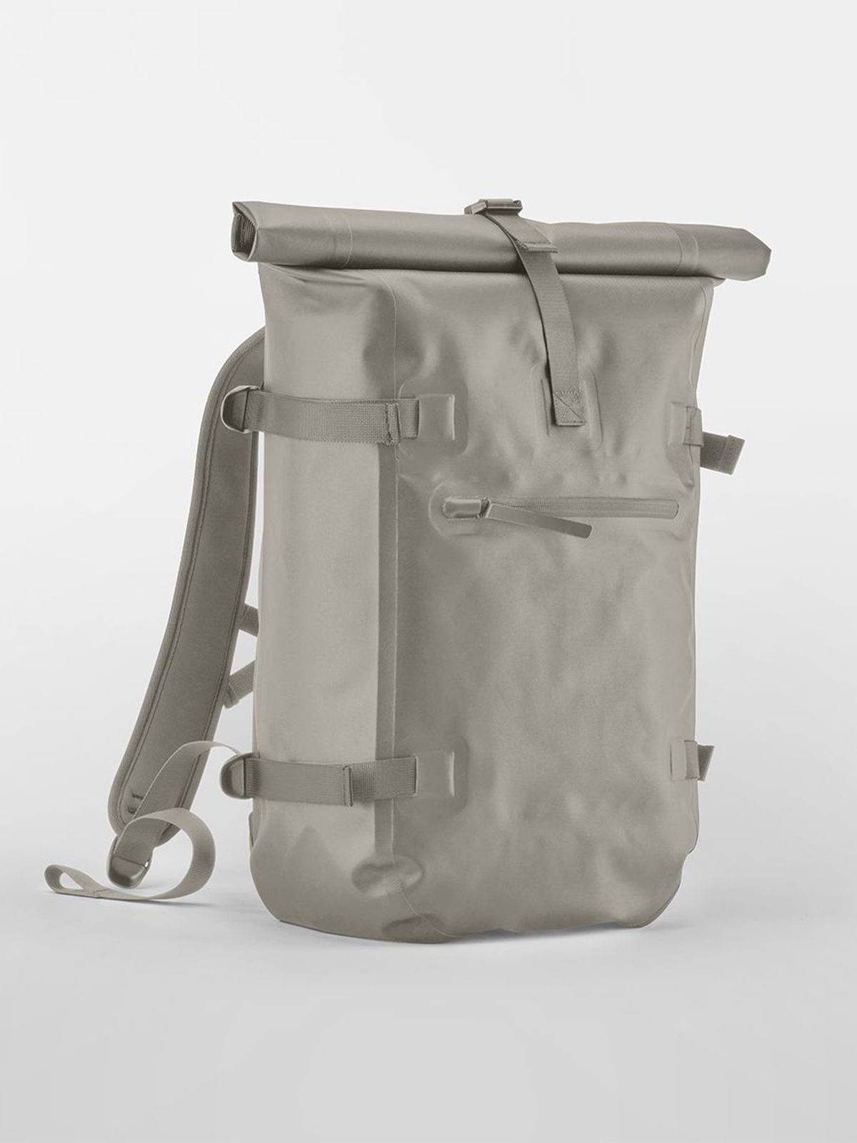 Zaino con chiusura roll-top, tessuto impermeabile, scomparto principale impermeabile, tasca frontale con zip, doppie cinghie di compressione laterali, spallacci imbottiti e regolabili. Dimensioni: 31x12.5x46cm, Capacità : 18 litri. Etichetta strappabile.