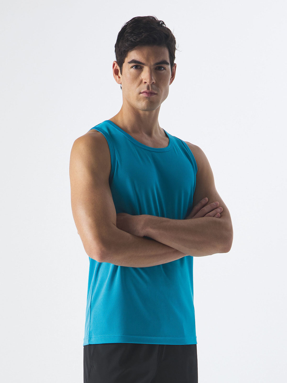 Canotta con girocollo e giromanica bordati, tessuto traspirante, struttura con cuciture laterali. Etichetta removibile.