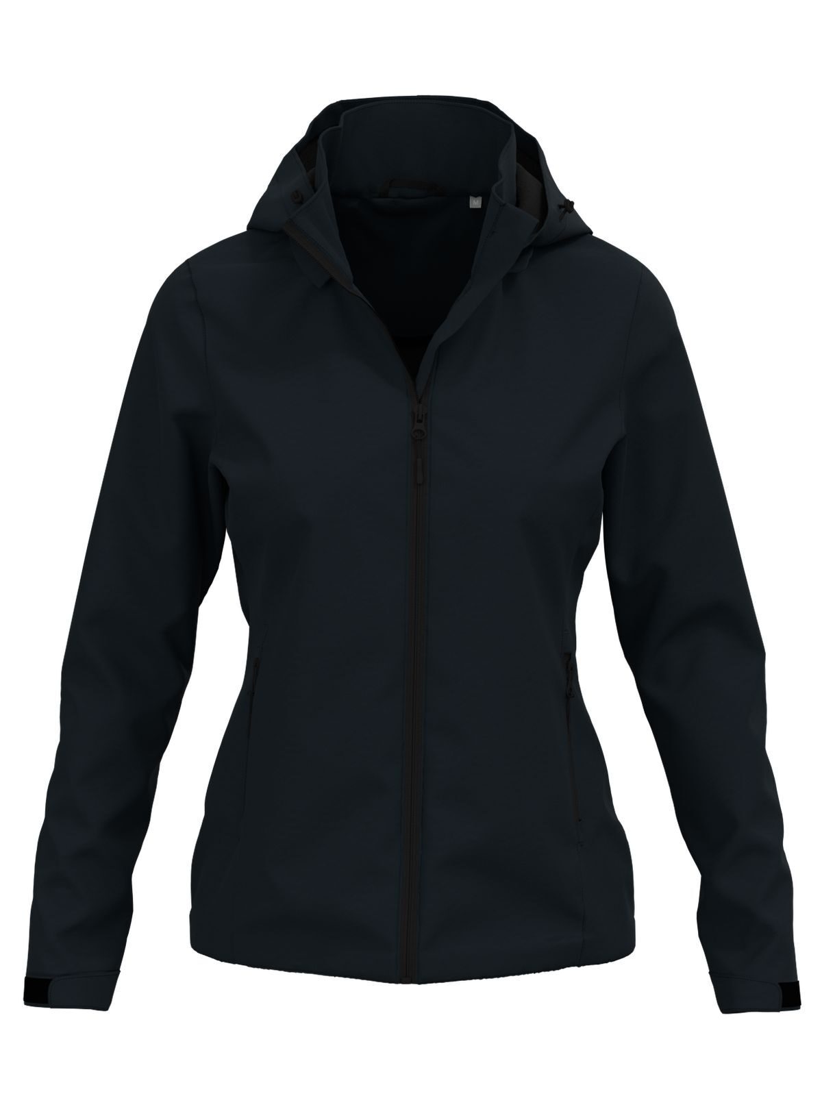 Giacca softshell donna con tessuto a 3 strati impermeabile (5.000 mm) e traspirante (1.000 g/m²), mezzaluna centrale posteriore per la personalizzazione, polsini e orlo regolabili, tasca interna, cappuccio rimovibile e regolabile, 2 tasche laterali con cerniere di alta qualita', bordo di protezione dal vento, etichetta Premium con la taglia tessuta sulla nuca, ed etichetta di manutenzione a strappo nella cucitura laterale, senza fluoro e PFC.