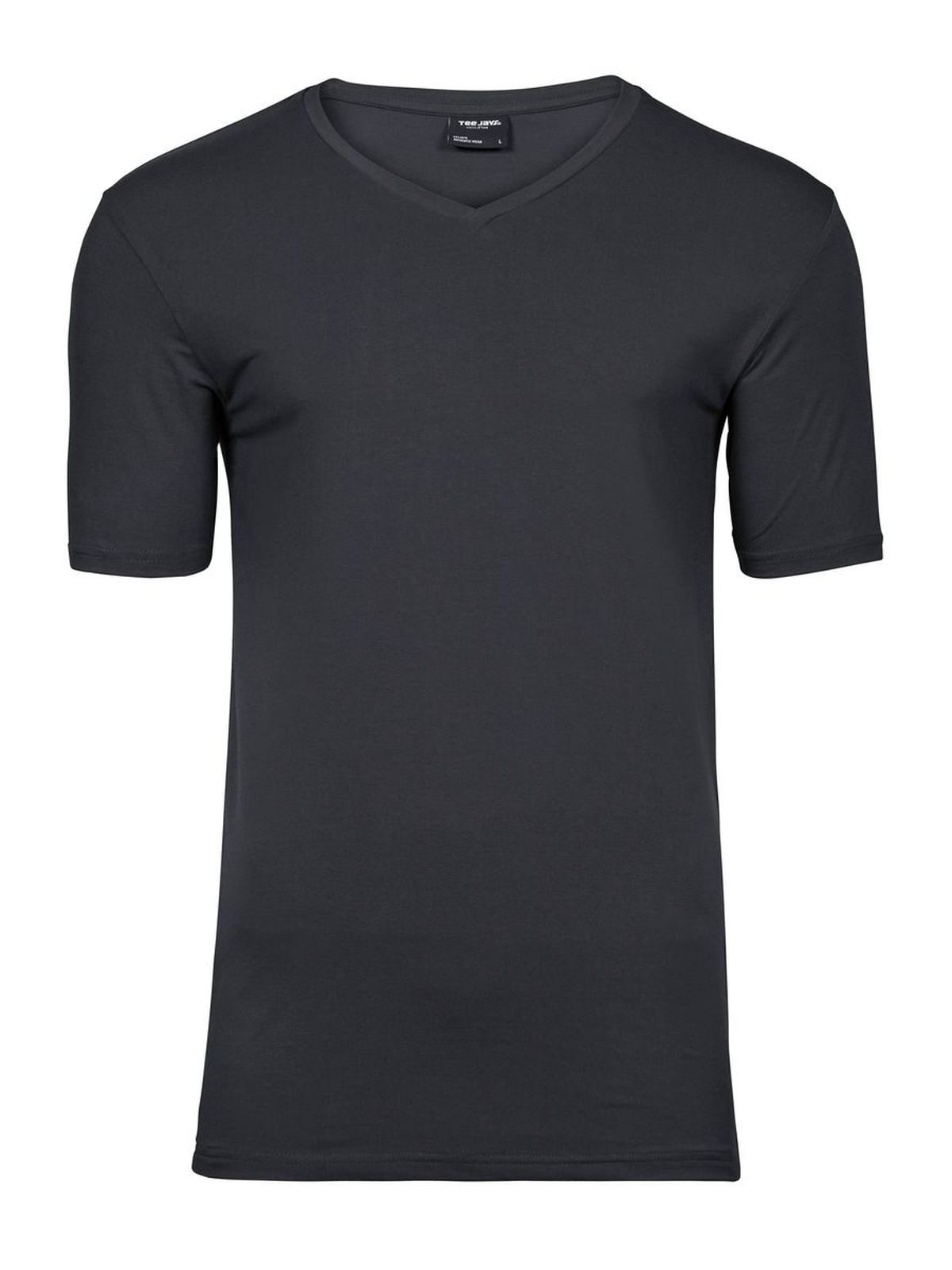 T-shirt uomo collo a V, 195 g/m², 90% cotone pettinato ring-spun, 10% elastan, elastan conferisce maggior stabilità e morbidezza, pre-ristretto, capo trattato con enzimi per un tessuto più soffice, fettuccia al collo, collo in Lycra, doppia cucitura