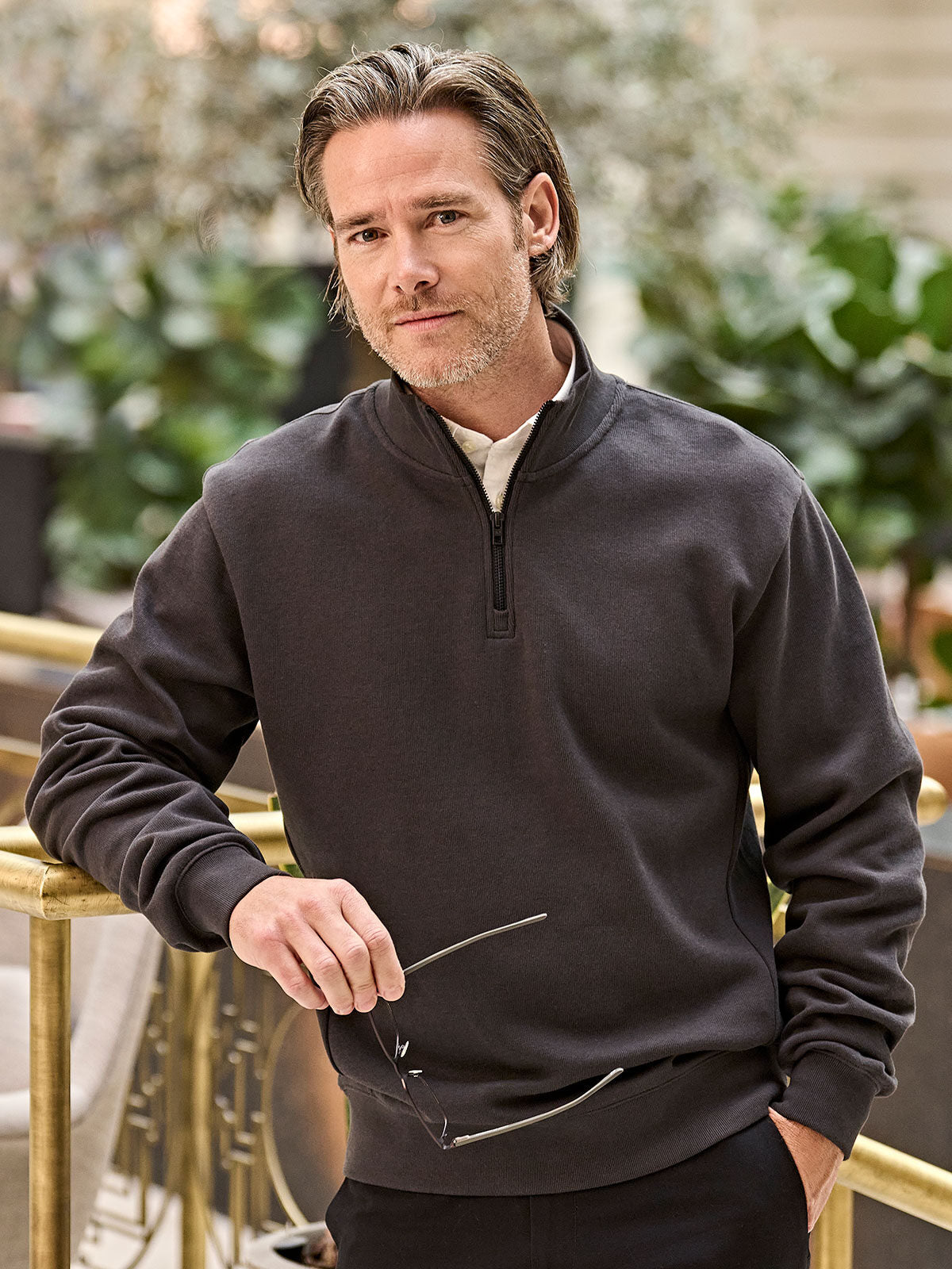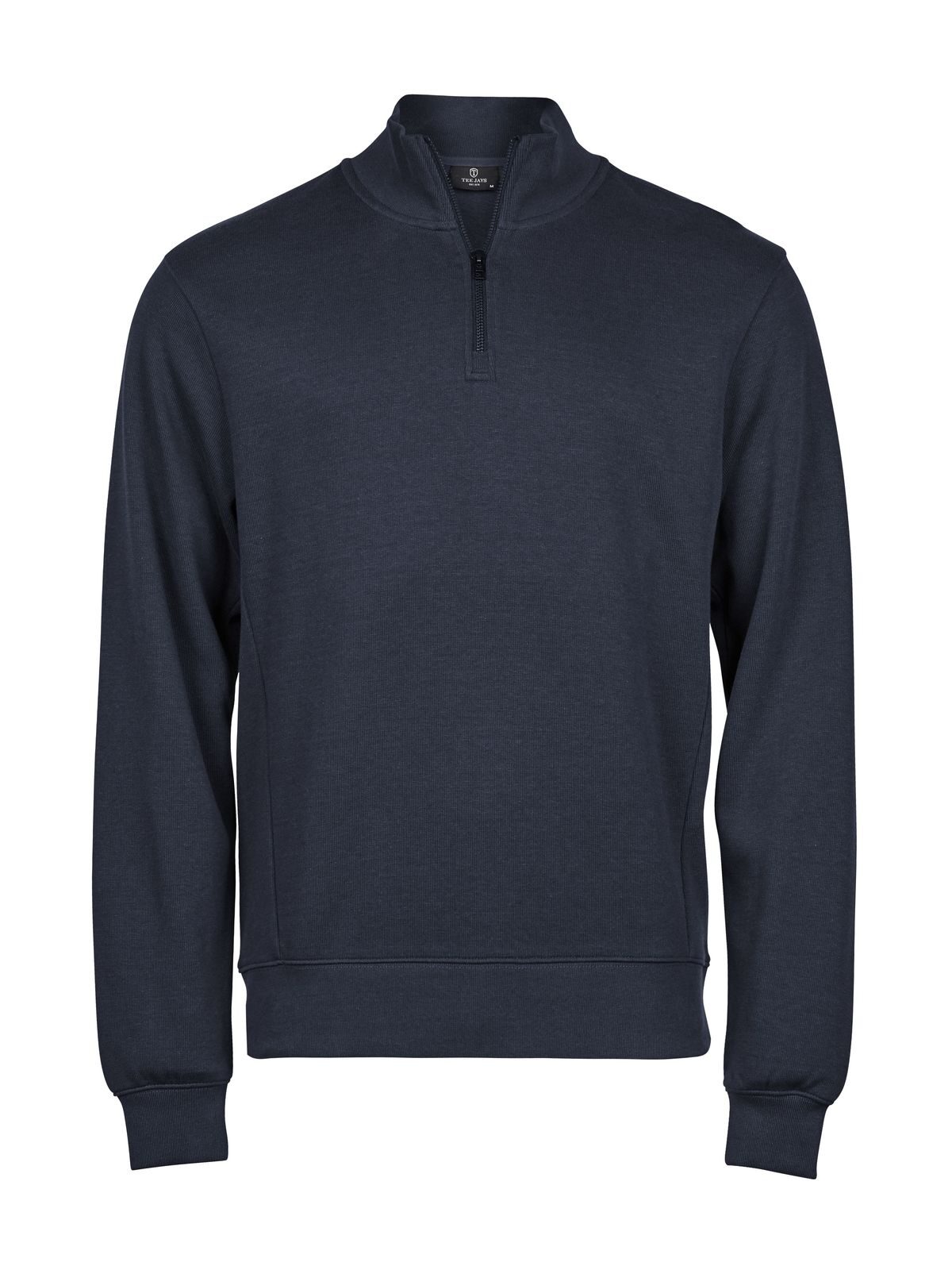 Felpa mezza zip in interlock a coste, polsini, collo e fascione a costine con elastane, cerniera SBS.