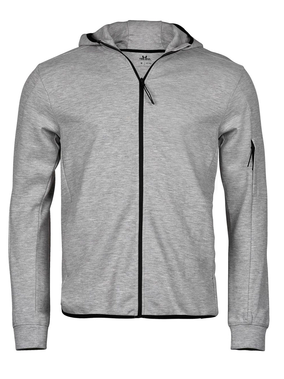 Felpa in interlock con zip e cappuccio, due tasche frontali aperte, una tasca sulla manica con chiusura zip con cordoncino, polsini nello stesso tessuto della felpa, orlo elasticizzato.