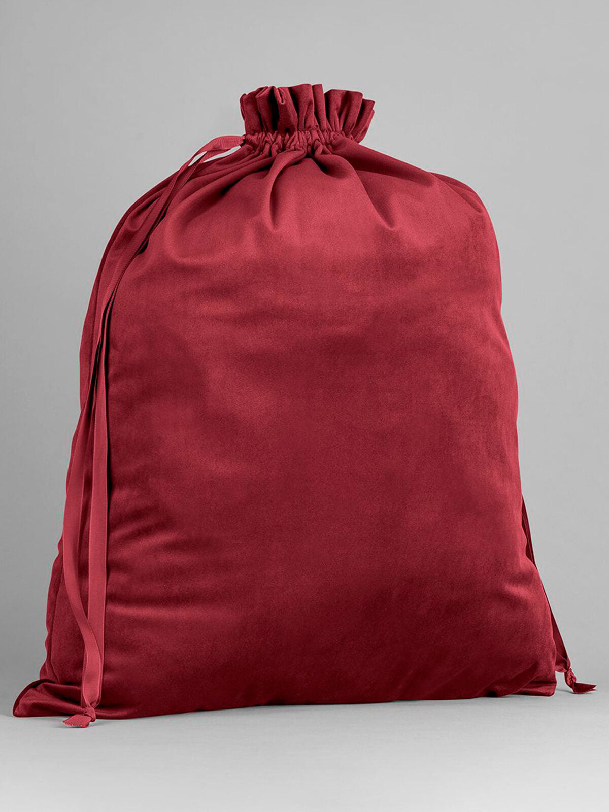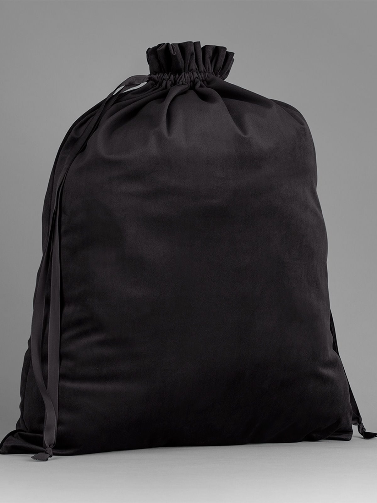 100% poliestere riciclato. Sacca in velluto, chiusura con coulisse, nastro in gros-grain, multiuso. Etichetta removibile. Dimensioni: S: 24x17cm, M: 44x36cm, L: 68x54cm.