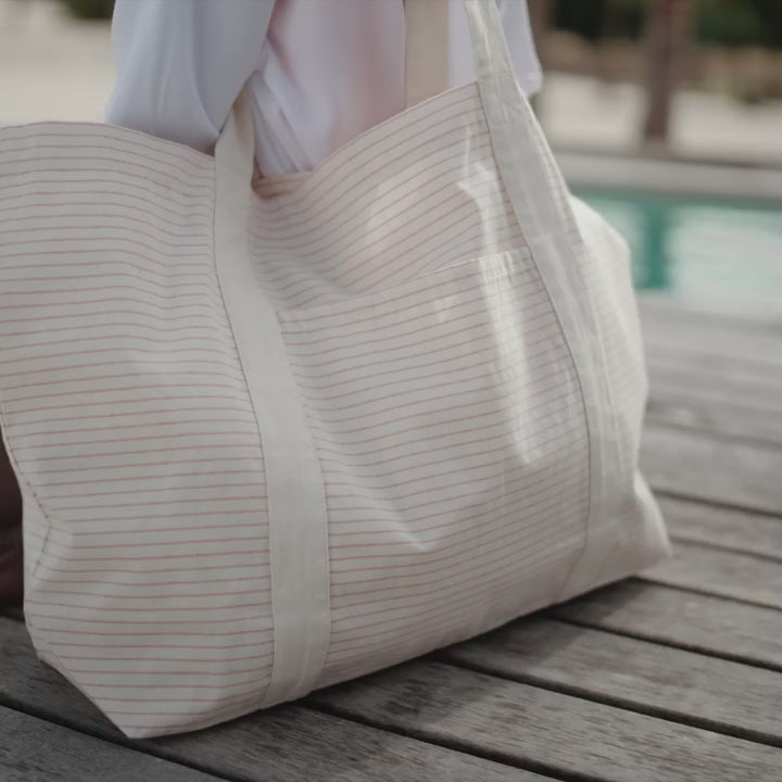 Shopper a righe in cotone organico certificato GOTS -CU811033, ampia capienza, con tasca frontale profonda, può essere portata a mano o in spalla. Lunghezza del manico: 69 cm. Dimensioni: 45x37x14cm. Capacità : 21 litri. Area di stampa: 19x24cm. Etichetta strappabile.