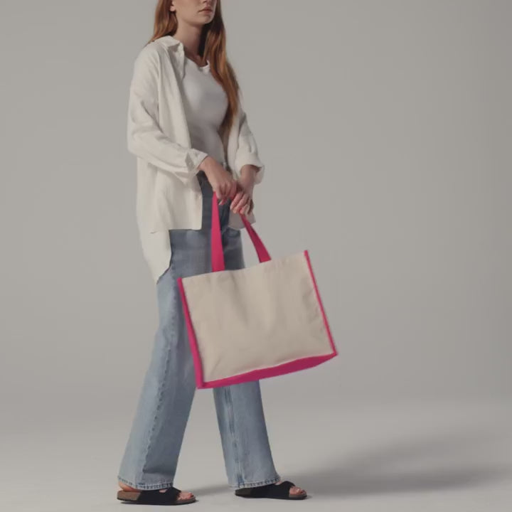 Shopper con pannelli laterali in cotone Canvas. Etichetta removibile. Lunghezza manici: 60 cm, dimensioni: 42 x 33 x 19 cm, capacita': 21 litri, area stampabile: 34 x 26 cm.