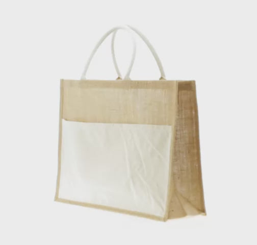 Shopper multiuso in juta laminata con tasca frontale in 100% cotone. Etichetta removibile. Lunghezza manici: 35 cm. Dimensioni: 26 x 22 x 14 cm, capacita': 6 litri, area stampabile: 21 x 13 cm. Removable label.