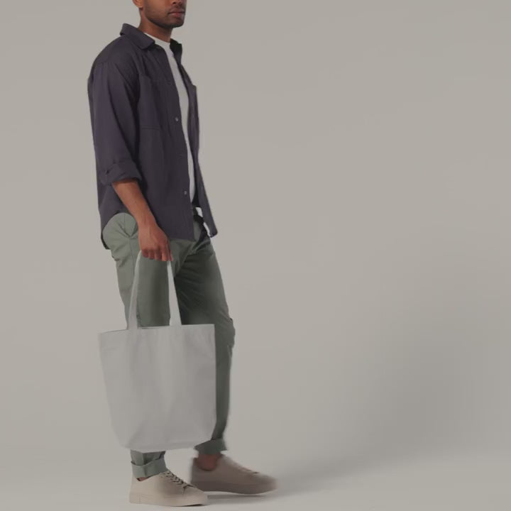 Shopper certificata commercio equo e solidale. Etichetta removibile. Lunghezza manico: 58 cm, dimensioni: 28 x 38 x 12 cm, capacita': 13 litri, area stamapabile 28 x 28 cm.