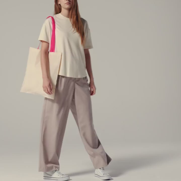 Borsa in cotone certificato OCS, manici in colore contrastante, tessuto resistente, può essere portata a mano o in spalla. Etichetta removibile. Lunghezza manico: 67 cm. Dimensioni: 38 x 42 cm, capacità: 10 litri, area stampabile: 33 x 36 cm.