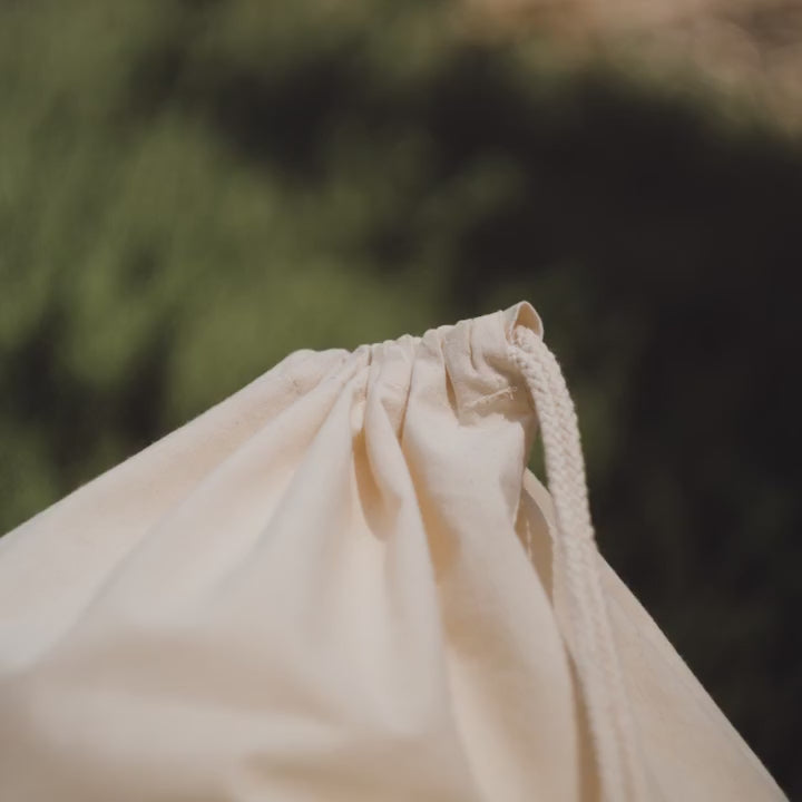 Sacchetto in cotone riciclato GRS, certificato da Control Union CU811033 con cordini in cotone riciclato. Etichetta removibile. Dimensioni: XXS: 10x15 cm, cap. 0,25 lt. - XS: 14x20 cm, cap. 1 lt. - S: 25x30 cm, cap. 3 lt. - M: 30x45 cm, cap. 8 lt. - L: 40x50 cm, cap. 14 lt. - XL: 49x75 cm, cap. 38 lt.